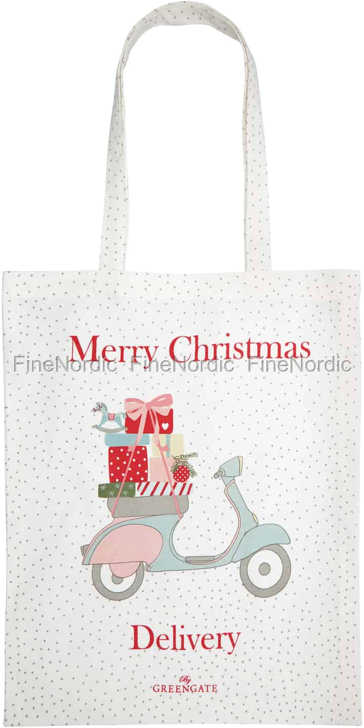 Die helle GreenGate Baumwolltasche aus der Scooter White Serie ist mit vielen hellgrauen Pünktchen geschmückt, die einen an fallenden Schnee erinnern. Auf des Henkelbeutels Vorderseite ist mittig ein rosa-hellblaufarbener Scooter im Vintage Stil zu sehen. Auf seinen Sitz sind viele, in verschiedenem Geschenkpapier eingepackte Pakete, gestapelt, und diese sind mit einer rosa Schleife am Sitz festgebunden. Wer genau hinschaut wird auch ein kleines Schaukelpferd und eine Weihnachtskugel auf dem Stapel entdecken können. Obendrüber steht in roten Buchstaben geschrieben: Merry Christmas und untendrunter steht Delivery und dazu auch die Worte by GreenGate. Dank seines schönen Weihnachtsmotivs bietet sich der Henkelbeutel gut als Einkaufstasche für die Weihnachtszeit an. Auch können mit dem Weihnachtsbeutel stilvoll Geschenke überreicht werden.