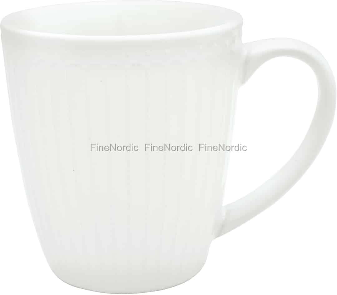 Die Alice White Tasse von GreenGate sieht schlicht und doch sehr edel aus in ihrem monochromen Look. Weiß ist wohl die klassischste aller Geschirrfarben und liegt auch heute noch voll im Trend. Die weiße Henkeltasse ist auf der Außenseite mit einem hübschen Striche- und Punkterelief geschmückt und die Innenseite ist glatt. Kaffee, Tee und Co schmecken aus der zeitlosen Schönheit besonders gut. Die einfarbig weiße Porzellantasse kann gut mit den übrigen Alice White Geschirrteilen kombiniert werden, aber auch neben Stoneware aus vielen anderen GreenGate Serien macht sie eine gute Figur auf dem Tisch.