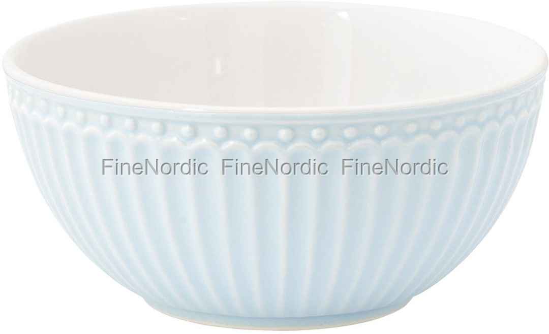 Ob als Müslischale, Frühstücksschale oder Dessertschale, die Alice Pale Blue Schale von GreenGate kann für alle Zwecke genutzt werden. Die kleine hellblaue Porzellanschale ist an ihrer Außenseite mit dem markanten Alice Relief geschmückt. Die helle, glatte Innenseite bietet einen schönen Kontrast zu der himmelblauen Farbe. Decke den Tisch mit dem wohlgestalteten Geschirr aus GreenGates Alice Pale Blue Serie oder mische es mit Stoneware aus anderen, farblich passenden GreenGate Serien, um so den Tisch noch bunter und interessanter aussehen zu lassen.