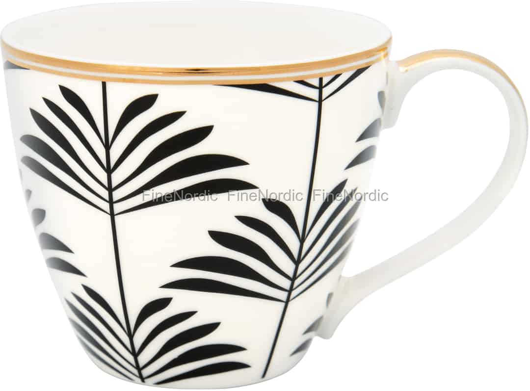 Die GateNoir Kollektion von GreenGate ist vom Art Deco Stil der 1920er Jahre inspiriert und dies spiegelt sich auch in dieser Tasse wider. Die Maxime Black Tasse von GreenGate zeichnet sich durch ihr schwarzes Palmblatt Design auf weißem Hintergrund und ihren metallisch schimmernden Details aus. Die Porzellantasse hat ein Fassungsvermögen von 300 ml und ist an ihrem großen Henkel leicht hochzuheben und zu tragen. Sie können den Henkelbecher gut mit den anderen Porzellanprodukten aus der Maxime Black Kollektion von GreenGate kombinieren. Wenn Sie dem Tisch noch mehr Farbe verleihen möchten, dann stellen Sie einfach auch Maxime Blue und Maxime Coral Geschirr dazu und erfreuen Sie sich an Ihrem farbenfroh gedeckten Tisch.