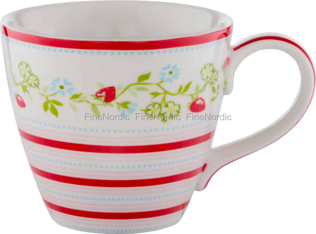 Kaum betrachtet man diese Gloria White Tasse und schon beginnt man von Sommer und Sonne zu träumen. Das verspielte Erdbeer- und Blumendesign umgibt den oberen Teil der Tasse und wird von roten Linien eingerahmt. Diese sommerliche Tasse hat ein Fassungsvermögen von 300 ml und dank ihres großen Henkels, ist sie gut und einfach zu halten. Sie ist sowohl spülmaschinen- als auch mikrowellenfest. Genießen Sie eine schöne Tasse Kaffee oder Tee mit dieser limitierten Tasse von GreenGate.