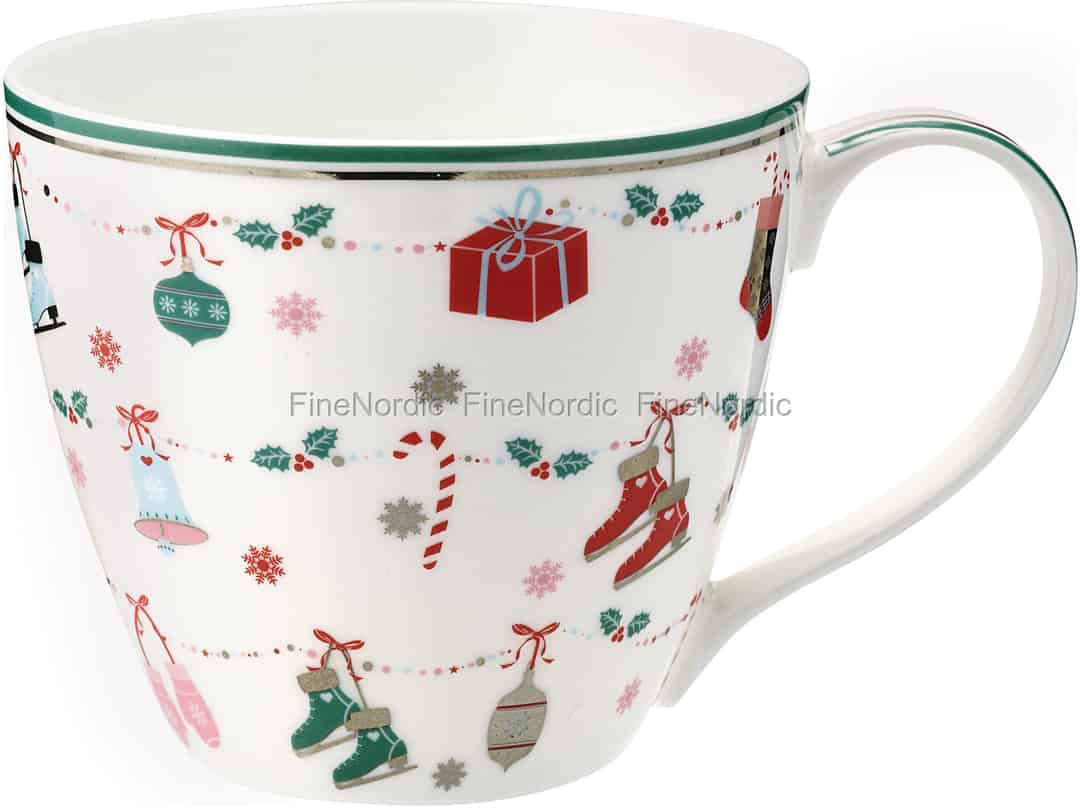 Die bezaubernde Jingle Bell White Tasse von GreenGate ist fast zu hübsch, um sie nur zur Weihnachtszeit zu benutzen. An den drei Girlanden, die die Außenseite der Tasse umkreisen, hängen Schlittschuhe, Fäustlinge, Geschenke und viele andere weihnachtliche Dinge. Die Tasse hat ein Fassungsvermögen von 300 ml und ist durch ihren großen Henkel ganz einfach zu halten. Wenn Ihnen das Muster der Tasse genauso gut gefällt wie uns, dann schauen Sie sich doch auch mal all die anderen Jingle Bell White Produkte in unserem Webshop an. Kaum zu glauben: Wenn man eine heiße Tasse Tee oder Kaffee an einem ganz stinknormalen Tag aus dieser charmanten Tasse genießt, dann fühlt der sich auf einmal wie Weihnachten an.