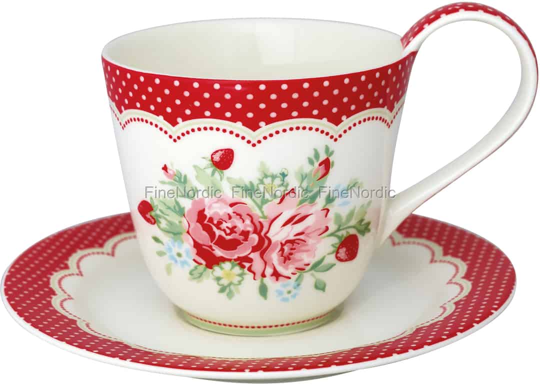 Mit dieser schönen Mary White Tasse und Untertasse von GreenGate wird das Kaffee oder Tee trinken zu einem wahren Genuss werden. Das Mary White Design besteht aus Erdbeeren, Blumen und einem hübschen rot-weißen Punkte Muster. Rote und rosafarbene Rosen sind in der Mitte der Tasse zu sehen und die Untertasse glänzt mit einem hübsch gepunkteten Rand. Dank des großen Griffs ist es wirklich leicht die Tasse zu halten und zu tragen. Wenn Sie Ihren Teelöffel nicht benutzen, dann kann er bequem auf der Untertasse ruhen. Wir glauben, dass ein Stück Schokolade oder ein Keks dort auch einen Platz finden könnte. Wenn Ihnen dieses Muster gefällt, dann sollten Sie sich unbedingt auch die anderen Artikel aus der Mary White Serie in unserem Webshop anschauen. Wir bieten nicht nur Geschirr an, mit diesem schönen Design, sondern auch verschiedene Textilien.