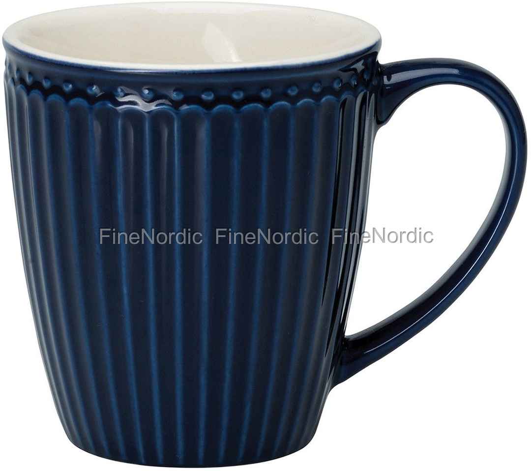 Diese dunkelblaue Alice Tasse aus der Everyday Serie von GreenGate hat eine Kapazität von 300 ml und ist sowohl praktisch als auch gutaussehend. Sie ist leicht an ihrem gut dimensionierten Henkel zu halten und ist aufgrund ihrer hübschen blauen Farbe und des gerippten Designs ein wahrer Blickfang. Sie ist sowohl spülmaschinen- als auch mikrowellenfest. Das ist sehr praktisch, vor allem, wenn der Alltag ein wenig geschäftig und hektisch wird. Die Außenseite der Tasse ist dunkelblau, was einen schönen Kontrast zum weißen Inneren der Tasse darstellt. Sie können sie mit anderem Alice Dark Blue Geschirr und auch mit verschiedenen farbigen Alice Geschirrteilen kombinieren. Sie können sie dazu auch mit Geschirr aus GreenGates gemusterten Serien mischen. Lassen Sie Ihren Tisch so bunt oder monochrom aussehen, wie es Ihnen gefällt. Mit GreenGate Geschirr können Sie den Tisch so individuell decken wie Sie es selbst sind.