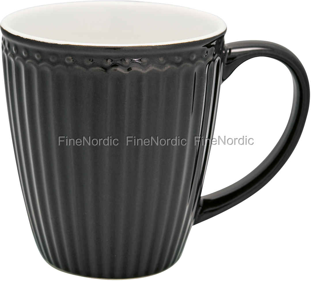 Die dunkelgraue Alice Tasse Dark Grey von GreenGate hat ein schlichtes und dennoch stilvolles Design. Die dunkelgraue Außenseite bietet einen schönen Kontrast zu dem hellen Inneren der Tasse. Das gerippte Muster und die Reihe an Kreisen um den oberen Rand des Bechers verleihen ihm den markanten Alice Serie Look. Genießen Sie ihr liebstes Heiß- oder Kaltgetränk mit der Alice Dark Grey Mug von GreenGate. Kombinieren Sie sie mit gemusterten GreenGate Geschirrteilen oder decken Sie den Tisch nur mit Produkten von der Alice Dark Grey Serie ein. Mit GreenGate können Sie Ihren Tisch so monochrom oder so farbenfroh aussehen lassen wie Sie es wollen.