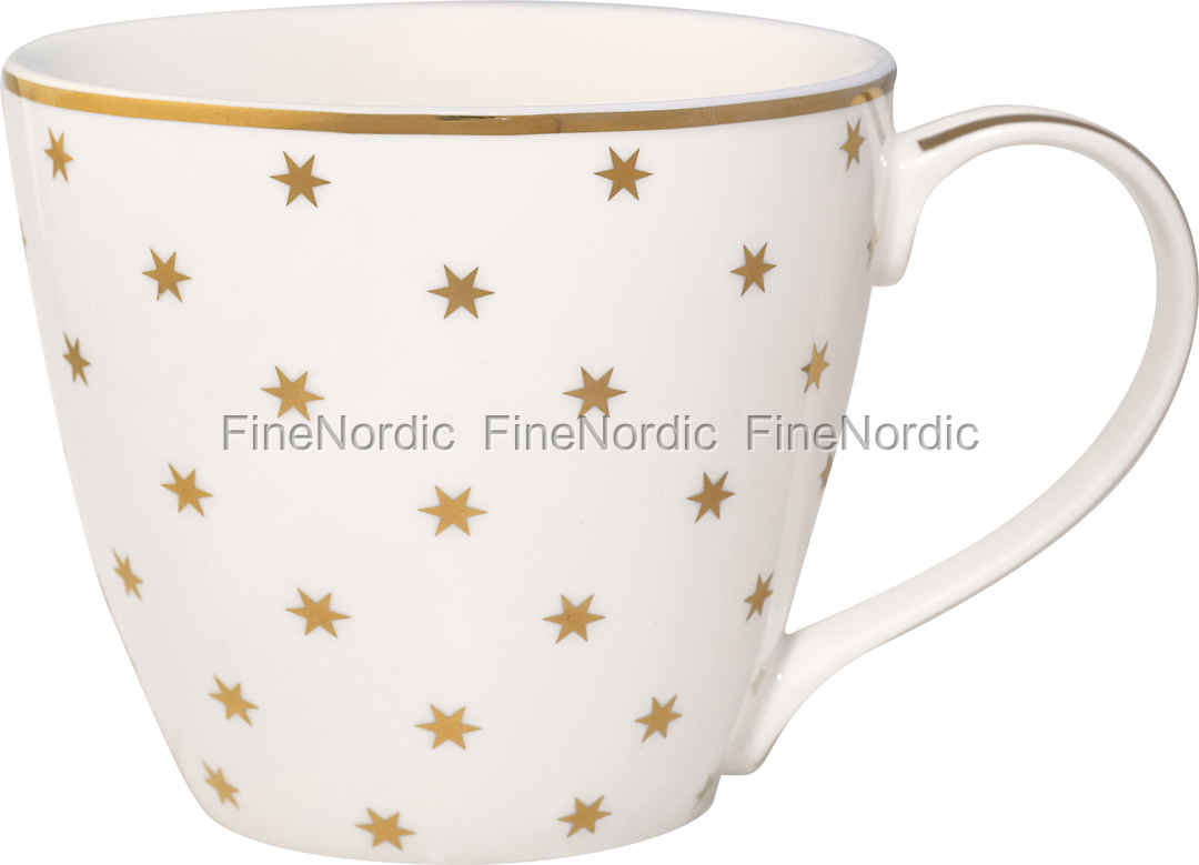 Diese schicke Tasse von GreenGate heißt Nova Gold. Das goldene Sternmuster und der feine Rand sehen elegant, dass Sie sie am liebsten durchgehend benutzen wollen werden. Diese Tasse wird Ihren Frühstückstisch luxuriöse aussehen lassen, besonders während der Weihnachtszeit. Verwenden Sie sie, um Kaffee, Tee oder heiße Schokolade zu trinken. Machen Sie es sich gemütlich mit Ihrer Familie in Wohnzimmer und genießen Sie etwas Tee aus der Nova Gold Tasse von GreenGate.
