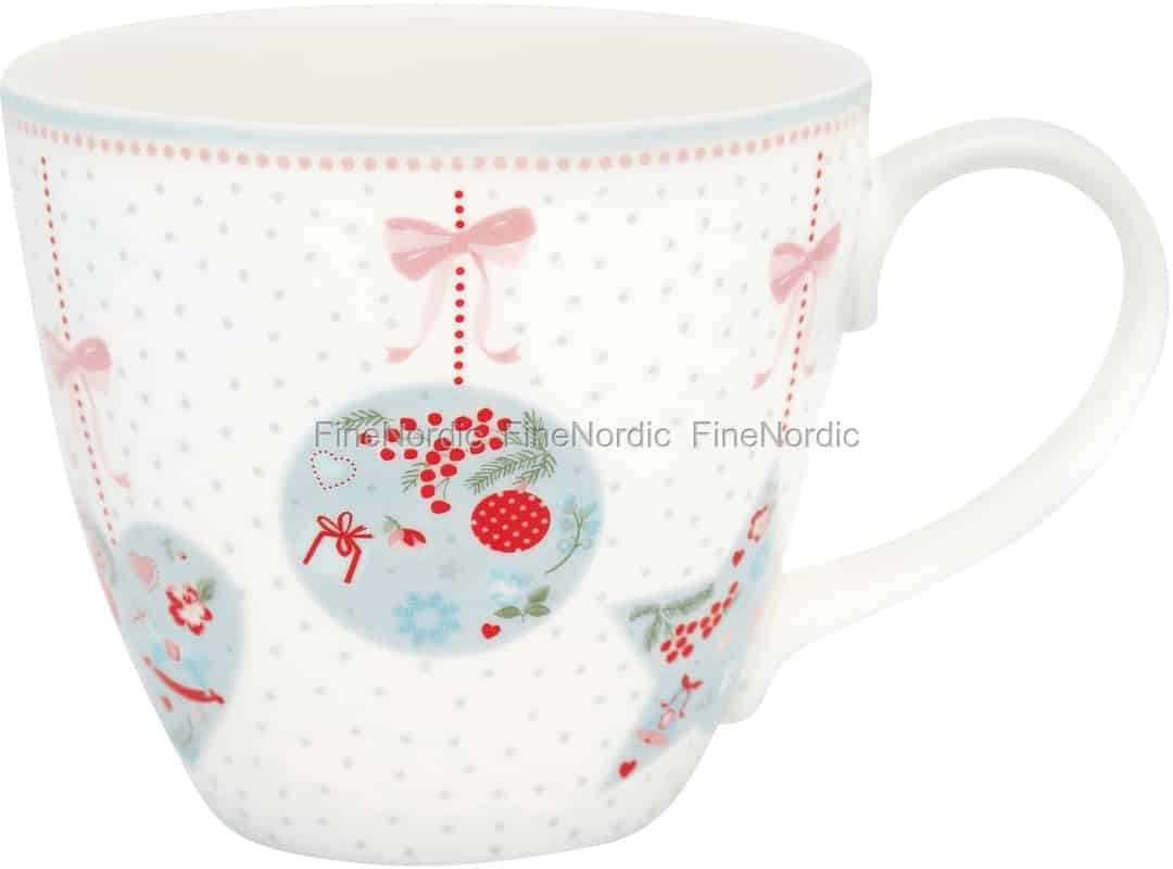 Mit dieser bezaubernden Sandie White Tasse von GreenGate fühlt sich jeder Tag an wie Weihnachten. Der weiße Henkelbecher ist mit hellblauen Weihnachtsornamenten verziert, die von einer rot-weißen Schnur und einer rosa Schleife baumeln. Auf den Herz-, Kugel- und Sternornamenten können Sie andere Weihnachtsmotive in den Farben Rot, Blau und Grün sehen. Der weiße Hintergrund der Porzellantasse ist mit kleinen grauen Punkten bedeckt, was einen sehr an fallenden Schnee erinnert. Am Rand des Bechers sehen Sie eine gerade hellblaue Linie und eine gepunktete rosa Linie. Füllen Sie diese Porzellantasse mit ein paar Leckereien, wickeln Sie sie in Zellophan ein und binden Sie sie mit einem hübschen Band zusammen und schon haben Sie wunderschönes Weihnachtsgeschenk für Ihren Lieblingsmensch.