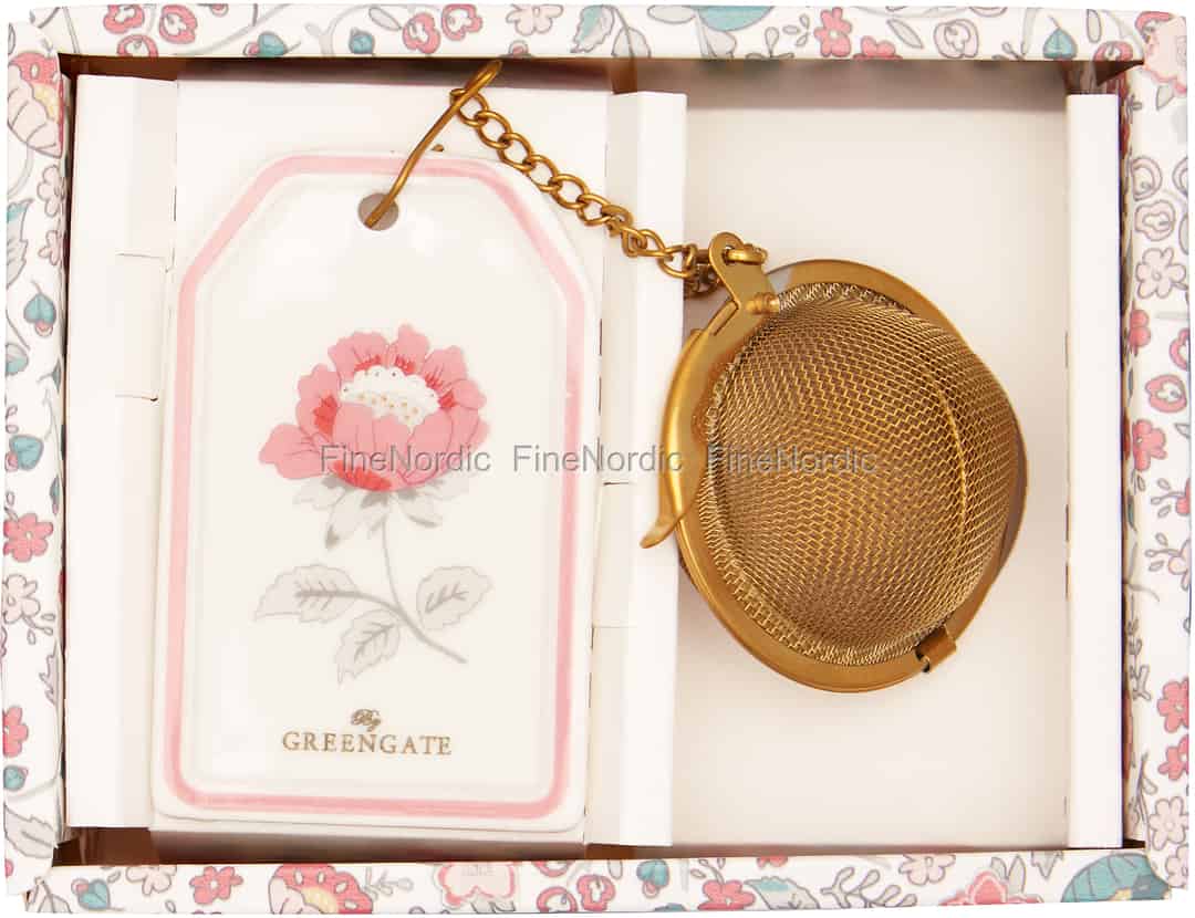 Der Teeinfuser Sienna White von GreenGate besteht aus einem goldfarbenen Tee-Ei, was mit einer Kette an einem Porzellananhänger befestigt ist, der einem Geschenkanhänger ähnelt. Das runde, goldene Metallsieb bietet einen hübschen Kontrast zu dem weißen Porzellananhänger. Der Anhänger ist auf der Vorderseite mit einer rosafarbenen Blume und den goldfarbenen Worten: by GreenGate geschmückt. Der Anhänger wird vorne von einer rosafarbenen Linie umrandet und seine Rückseite ist einfarbig weiß. Er wird in einer hübsch aussehenden Verpackung geliefert, welche mit pastellfarbenen Blümchen verziert ist. Das Tee-Ei aus der Sienna White Serie von GreenGate ist ein Must-Have für jeden Teeliebhaber.