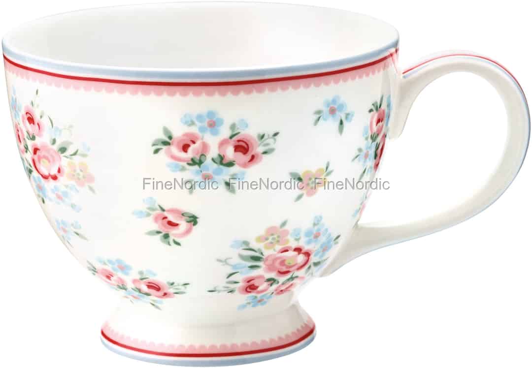 GreenGate Fans, und ganz besonders die, die die klassischen, blumigen GreenGate Geschirrserien so sehr mögen, werden von der Nicoline White Tasse begeistert sein. Die detaillierten, bunten Blumensträuße, die abgrenzenden, farblich aufeinander abgestimmten Linien entlang der Kanten und dem Henkel und das wunderschöne Gesamtbild der Porzellanteetasse, machen diese einfach unwiderstehlich. Mit dieser Stoneware Teetasse kann der alltägliche Nachtmittagstee aufs Feinste zelebriert werden. Dazu kann man die Henkeltasse wunderbar mit dem übrigen Porzellan und auch mit den Textilien aus der Nicoline White Serie kombinieren und auch gemischt mit Geschirrteilen aus anderen GreenGate Serien macht sie eine gute Figur auf dem Tisch.