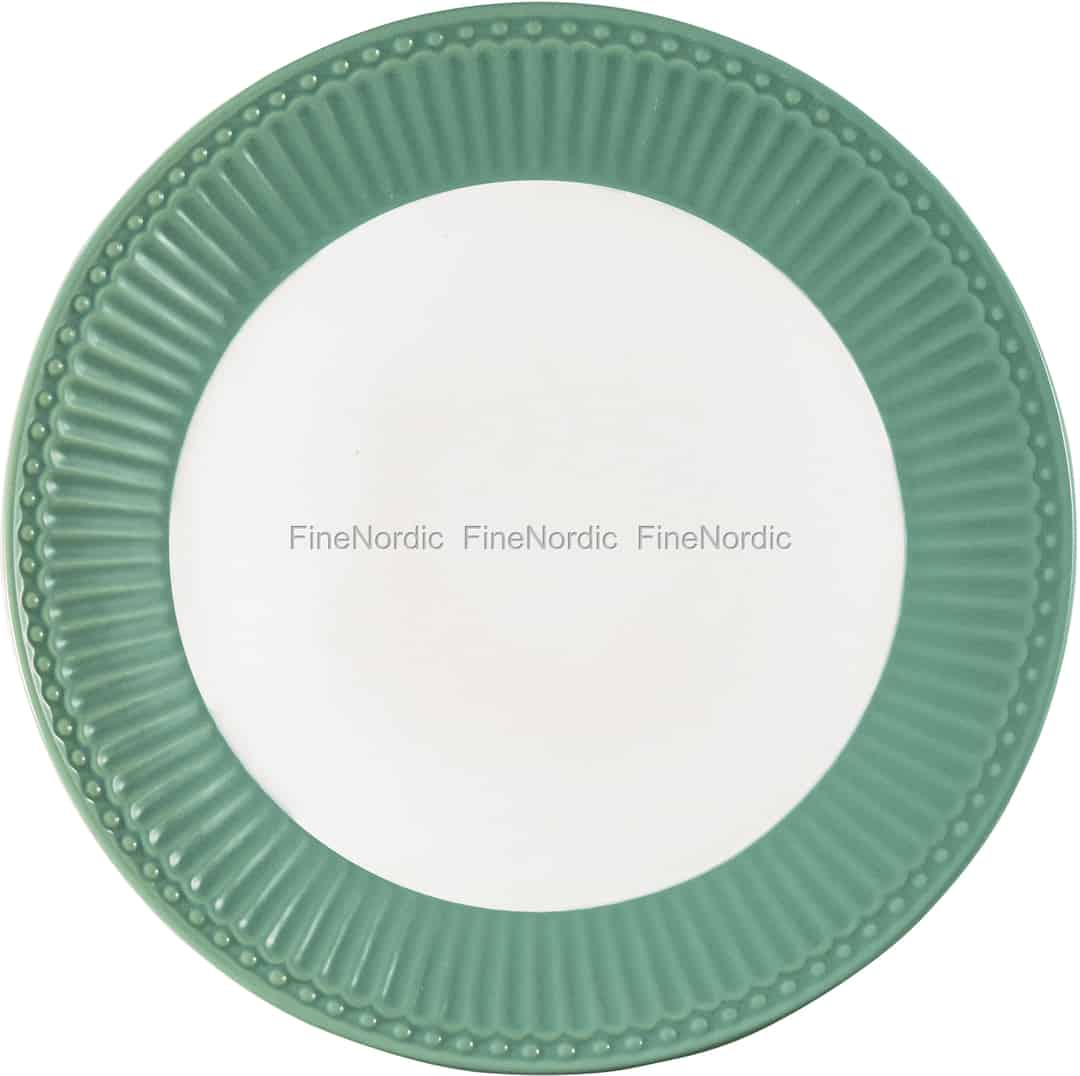 Der Alice Dusty Green Teller von GreenGate ist ein wahrer Blickfang dank seiner besonderen, staubgrünen Farbe. Der grüne Tellerrand ist mit einem stilvollen Relief geschmückt und bietet so einen tollen Kontrast zur glatten, hellen Tellermitte. Der zweifarbige Stoneware Teller kann gut für eine kleine Zwischenmahlzeit oder das Abendbrot genutzt werden. Sie können den grünen Porzellanteller auch ganz toll mit den übrigen Geschirrteilen aus der Alice Dusty Green Serie kombinieren und auch mit Stoneware aus anderen GreenGate Serien mischen.