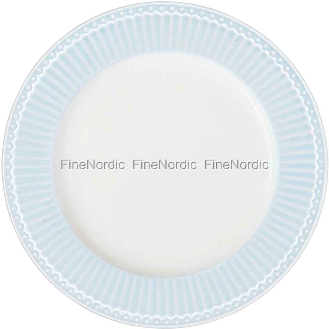 Der Alice Pale Blue Teller von GreenGate ist am Rand mit einem wunderschönen, hellblauen Relief geschmückt, welches einen tollen Kontrast zu der hellen Tellermitte bietet. Auf dem großen hellblauen Stoneware Teller können Sie Ihrem Gast die Hauptspeise wunderschön präsentieren und der hellblaue Rand rahmt das Essen so richtig schön ein. Beim Eindecken für ein mehrgängiges Menü kann der runde Hauptspeisenteller auch gut mit gemustertem Küchengeschirr von GreenGate gemischt werden. Oder Sie decken den Tisch Ton-in-Ton ein und stellen zu den Alice Pale Blue Tellern die anderen Geschirrteile aus der gleichen beliebten Everyday Serie.