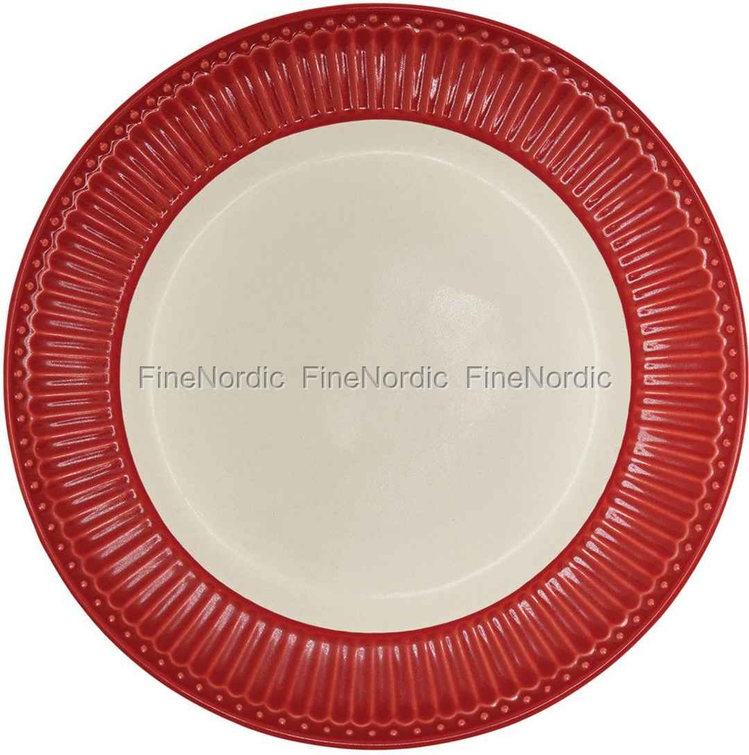 Der Alice Red Teller von GreenGate ist am Tellerrand mit einem weihnachtsrotem Striche- und Punkterelief geschmückt und seine glatte, helle Tellermitte bietet einen schönen Kontrast zum strukturierten Rand. Der rote Essteller kann zu Festtagen, wie z.B. in der Weihnachtszeit, aber auch im alltäglichen Leben genutzt werden. Der Hauptspeisenteller kann bei einem mehrgängigem Menü auch gut mit dem übrigen Alice Red Essgeschirr, sowie auch mit Porzellan aus anderen GreenGate Serien, kombiniert werden. Auch als Servierteller für ein paar kleine Appetithäppchen kann der große Stoneware Teller genutzt werden. Mit den Alice Red Speisetellern ist der Tisch immer schön eingedeckt und sie bieten dazu auch so viele Kombinationsmöglichkeiten mit anderem GreenGate Geschirr an.