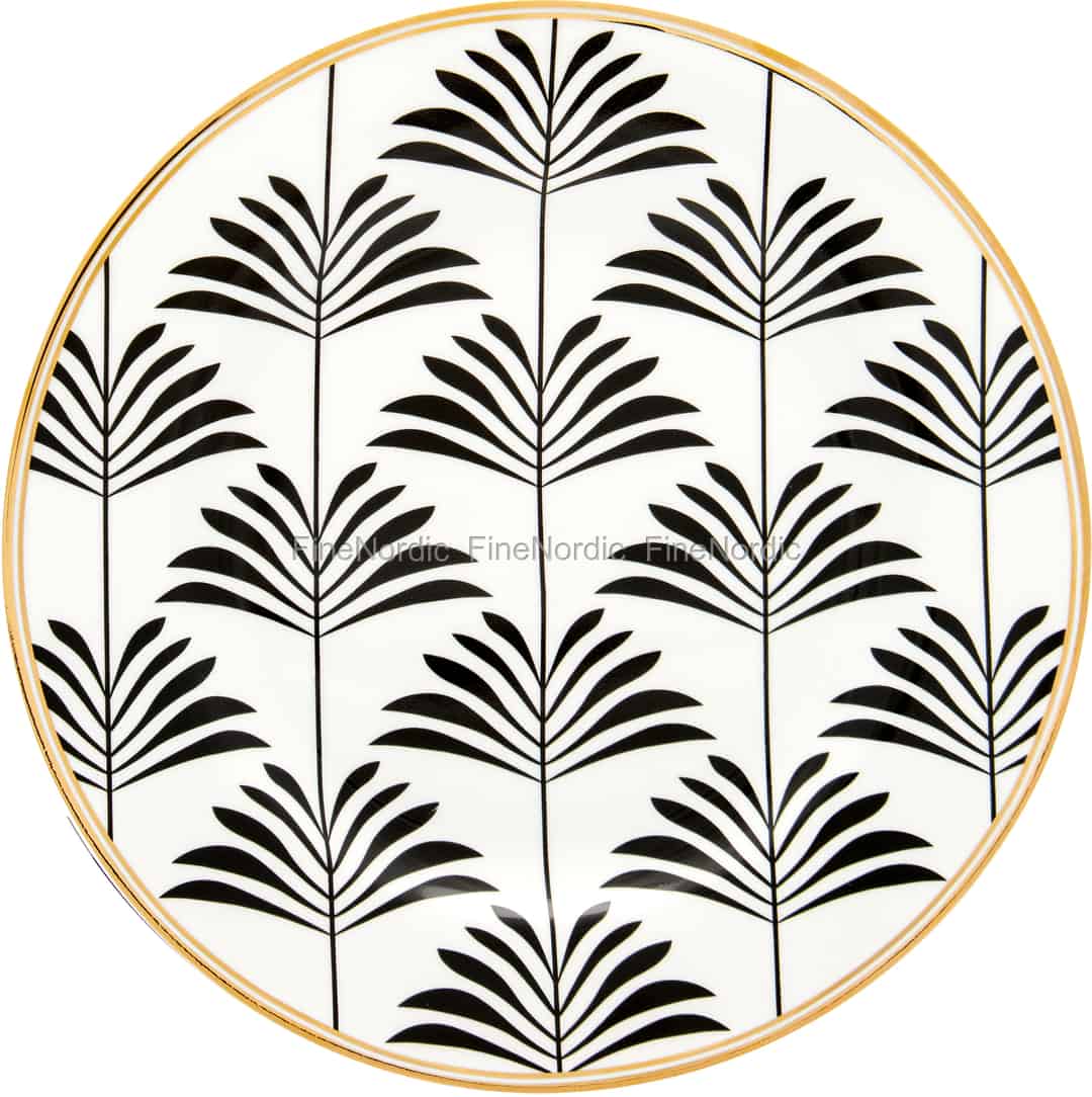 Auf diesem Maxime Black Teller aus der Gate Noir Kollektion von GreenGate sind schwarze Palmwedel auf weißem Hintergrund und ein metallisch schimmernder Rand zu sehen. Der Porzellanteller zeichnet sich durch sein atemberaubendes Design und seine glänzenden Details aus. Genießen Sie ein schönes Stück Kuchen oder ein köstliches Dessert mit diesem gut aussehenden Teller. Dieser runde Teller kann gut mit den anderen Maxime Black Geschirrartikeln sowie den Maxime Blue und Maxime Coral Geschirrteilen kombiniert werden, je nachdem, wie farbenfroh Sie Ihren Tisch decken möchten.
