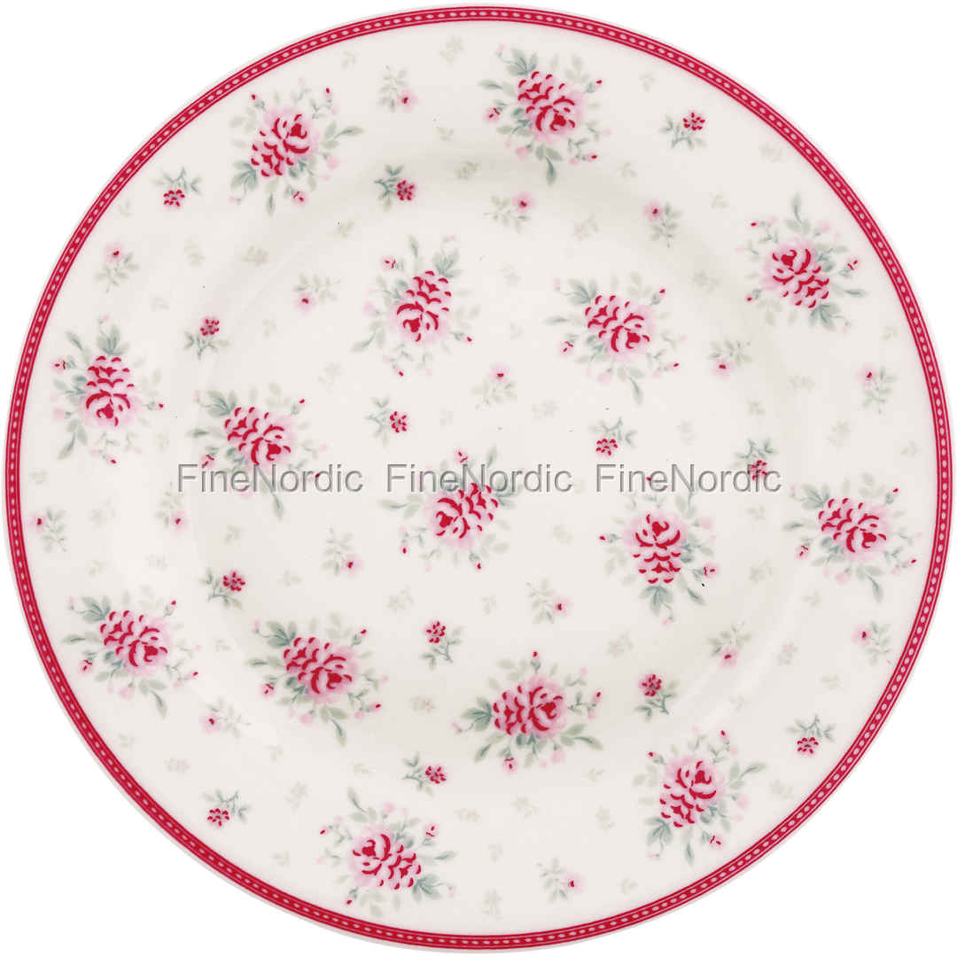 Sind Sie auf der Suche nach einem neuen Teller in Vintage-Look? Dann sollten Sie den Flora White Teller von GreenGate in Betracht ziehen. Er ist mit einem schönen Blumenmuster in blassgrau und mit verschiedenen Rottönen bedeckt. Ein wahres GreenGate Meisterwerk, welches von einem zarten roten Rand umrahmt wird. Kombinieren Sie den Teller mit anderen Teilen der Flora White Geschirrserie von GreenGate oder lassen Sie ihn neben einfarbigem Porzellan herausstechen.