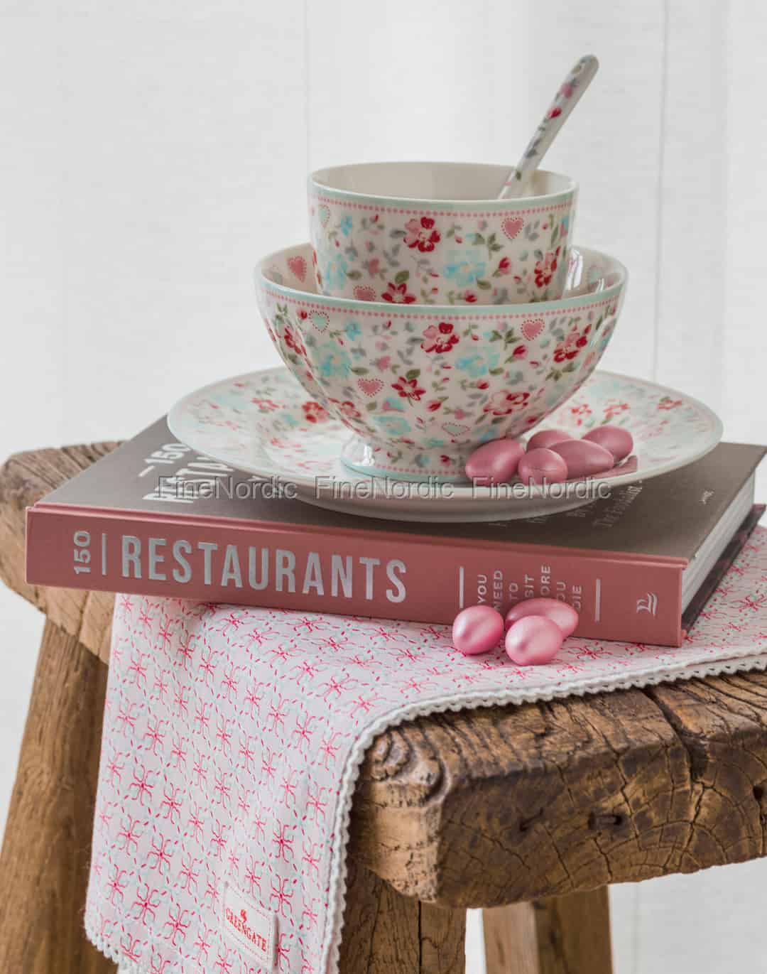Mit dem Merla White Teller, aus GreenGates limitierter Zwischensaison Kollektion, ist der Tisch schnell hübsch eingedeckt. Egal ob zum Brunch oder für einen schnellen Imbiss, der blumige Teller kommt viel und oft zum Einsatz. Das Auge isst ja bekanntlich mit und mit dem gut aussehenden Merla White Porzellanteller schmeckt das Sandwich gleich doppelt so lecker. Feine Herzchen und Blümchen in verschiedenen Rottönen und Pastellfarben verzieren den Stoneware Teller und dieser kann gut mit den anderen Porzellanteilen aus der gleichen Serie kombiniert werden. Auch neben Geschirr aus anderen GreenGate Serien, wie z.B. Sonia, macht der Feinkeramikteller Merla White eine gute Figur.