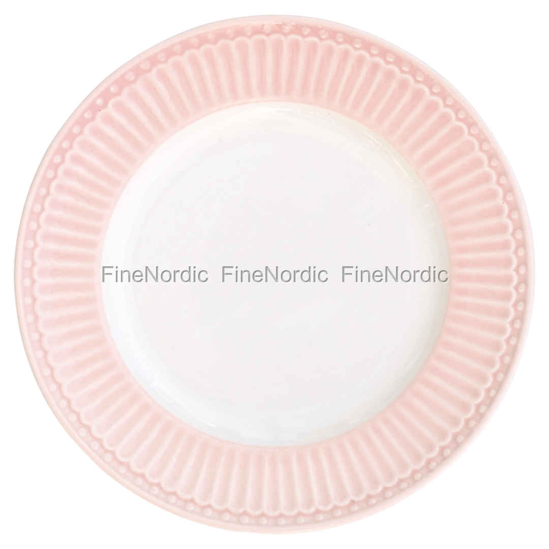 Frühstücksteller, Kuchenteller oder ein Snackteller für den kleinen Hunger zwischendurch? Der kleine Alice Pale Pink Teller ist all das und mehr. Die weiße Tellermitte, eingerahmt von einem gerillten rosa Rand, passt nicht nur farblich gut zueinander, auch das Design ist wunderschön. Ein weiteres Meisterstück der beliebten GreenGate Alice Serie. Denn nicht nur mit den anderen Geschirrteilen der Alice Serie lässt sich der Teller gut kombinieren, auch zusammen mit gemustertem Geschirr schaut der Teller fantastisch aus.