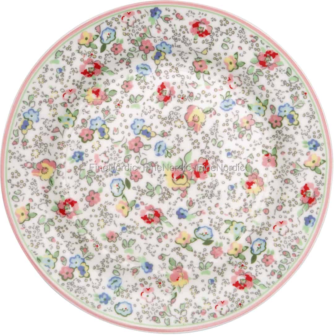 Der Vivianne White Teller von GreenGate ist mit kleinen Blumen bedeckt, welche von einem pastellfarbenen Rand eingerahmt werden. Der Porzellanteller kann zum Frühstück oder als Snackteller verwendet werden und Sie können auch Ihr Dessert davon essen. Der runde Teller ist sowohl spülmaschinen- als auch mikrowellengeeignet und kann im Alltag genauso gut verwendet werden wie auch zu besonderen Anlässen. Decken Sie den Tisch wunderschön ein mit den Geschirrteilen aus der Vivianne White Serie von GreenGate. Das hochwertige Geschirr mit seinen hübschen Farbkombinationen und dem sehr schön aussehenden Design werden Ihre Gäste beeindrucken. Wir sind sicher, das Essen wird gleich doppelt so gut schmecken, wenn Sie es von so schönem Porzellan essen, denn das Auge isst ja bekanntlich mit.