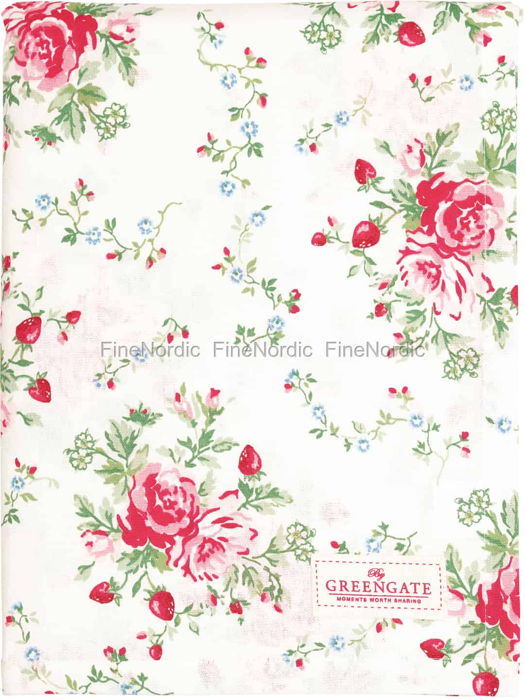 Die Mary White Tischdecke von GreenGate ist mit einem hübschen Rosen- und Erdbeermuster verziert und zwischendrin sind verspielte Blumenranken zu sehen. Der helle Hintergrund des Tischtuchs lässt die hübschen Farben des Musters besonders gut zur Geltung kommen. Decken Sie den Terrassentisch oder den Esstisch damit ein, stellen Sie das Mary White Porzellan darauf und Ihre Gäste werden von dem hübsch gedeckten Tisch begeistert sein. Die blumige Tischdecke kann auch gut mit Stoneware aus andere GreenGate Serien verwendet werden. Das ist genau das, was viele GreenGate Fans so lieben, dass man viele der Serien kombinieren kann und so sein ganz individuelles Tischgedeck kreieren kann.