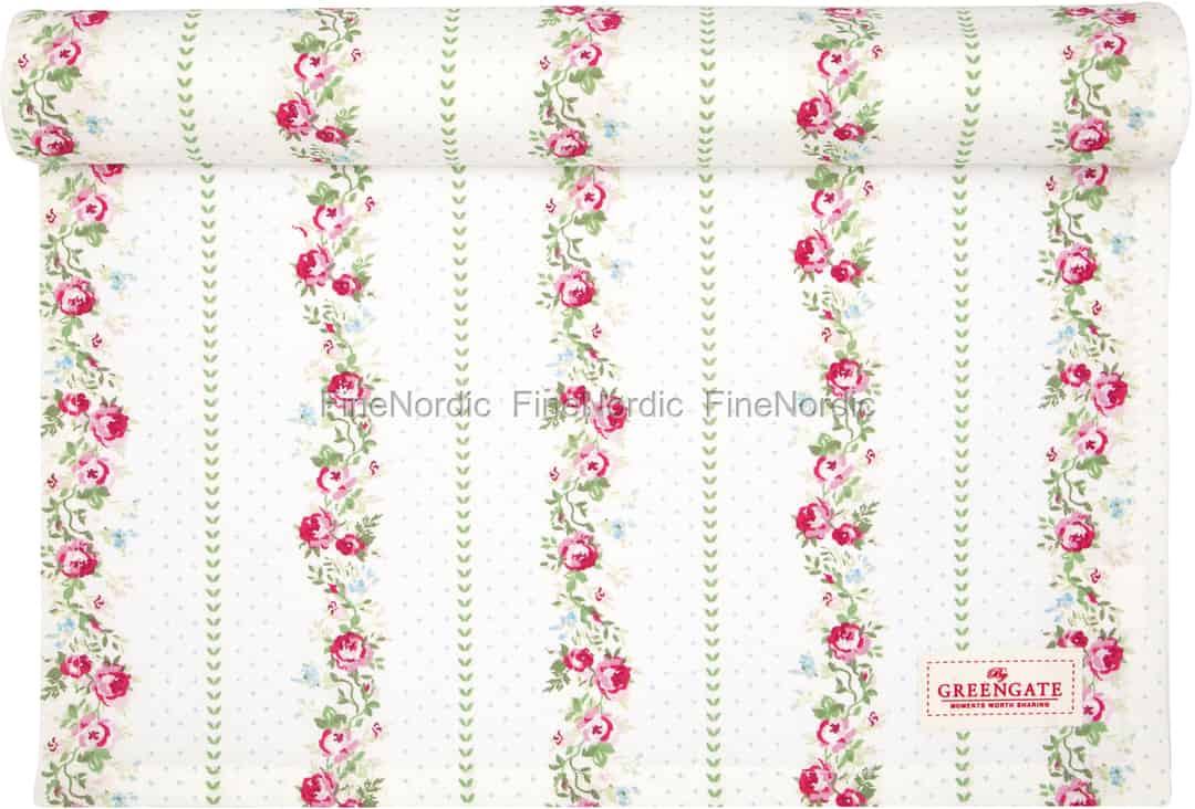 Tischläufer sind eine schöne Tischdeko, besonders wenn Sie nur ein kleines Highlight auf Ihrem gut aussehenden Tisch haben möchten, aber nicht die gesamte Tischplatte abdecken möchten. Der Gabby White Läufer von GreenGate ist mit Reihen wunderschöner Rosen auf einem pastellfarbenen, gepunkteten Hintergrund bedeckt. Der Baumwoll-Tischläufer verleiht Ihrem Tisch etwas Farbe und ein romantisches Feeling und er kann als Unterlage für Ihre Gabby White Porzellanteile sowie auch für Geschirr von anderen GreenGate Serien verwendet werden. Hübschen Sie Ihr Esszimmer mit diesem exquisiten Gabby White Tischläufer von GreenGate auf.