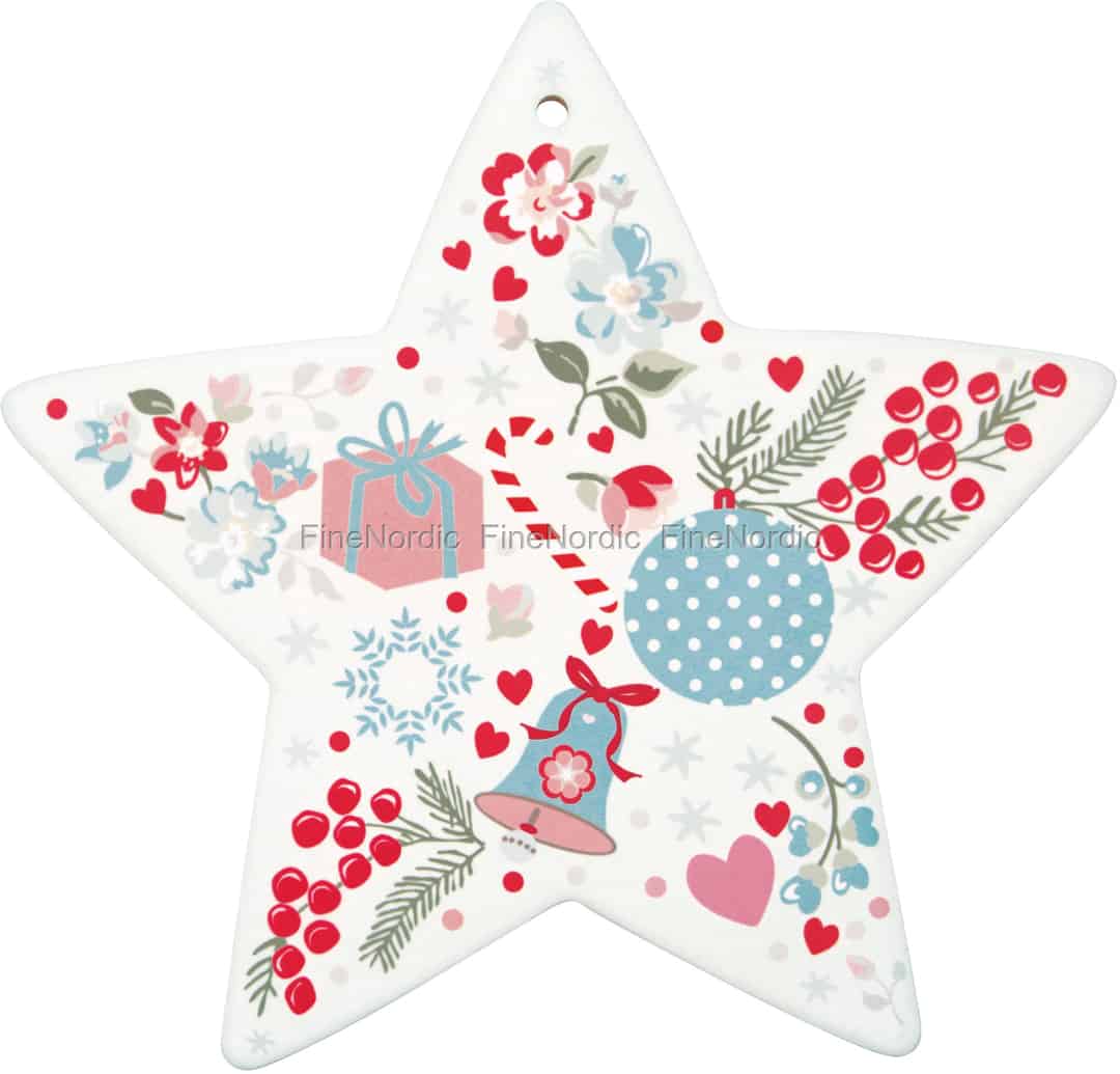 Wir mögen einfach alles an diesem Sandie White Untersetzer Stern von GreenGate: Die Form, die Farbkombinationen und ganz besonders das hübsche Design. Der fünfzackige, mintfarbene Stern ist mit einem Weihnachtsmuster in Rot und in verschiedenen Pastellfarben geschmückt. Auf dem Porzellanstern gibt es so viel zu entdecken: Ein Geschenk, eine Weihnachtskugel und -glocke, ein Schneekristall, sowie Herzen, Sterne, Blumen und Zweige. Sie können den Porzellanstern als Untersetzer nutzen, oder aber auch als Deko, indem Sie ihn bei seiner kleinen runden Öffnung, in einem der Zacken, aufhängen. Der Porzellanstern ist auf der Unterseite mit Kork versehen, was ihn sehr schonend für alle Oberflächen macht.