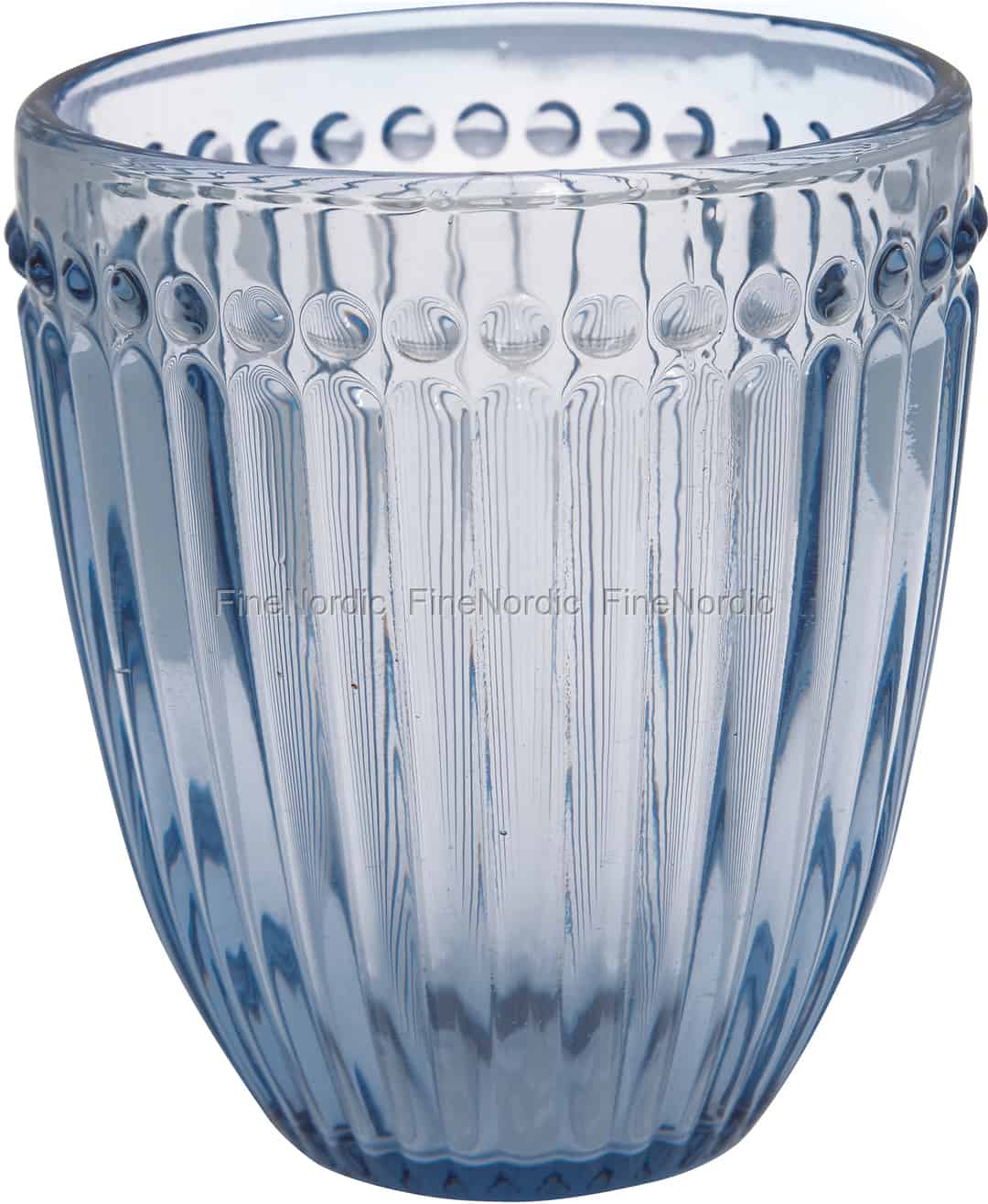 Das blaue Wasserglas Alice Blue von GreenGate ist eine tolle Kombination aus hübscher Farbe und attraktivem Design. Das Punkte und Striche Relief sieht ganz fantastisch aus auf dem 300 ml Glasbecher und das Glas liegt dazu auch gut in der Hand. Genießen Sie ein erfrischendes Glas Wasser oder Saft aus diesem gut aussehenden Trinkbecher. Sie können das Trinkglas mit der Stoneware aus vielen GreenGate Serien kombinieren, denn die Farbe Blau kommt in vielen Serien vor.