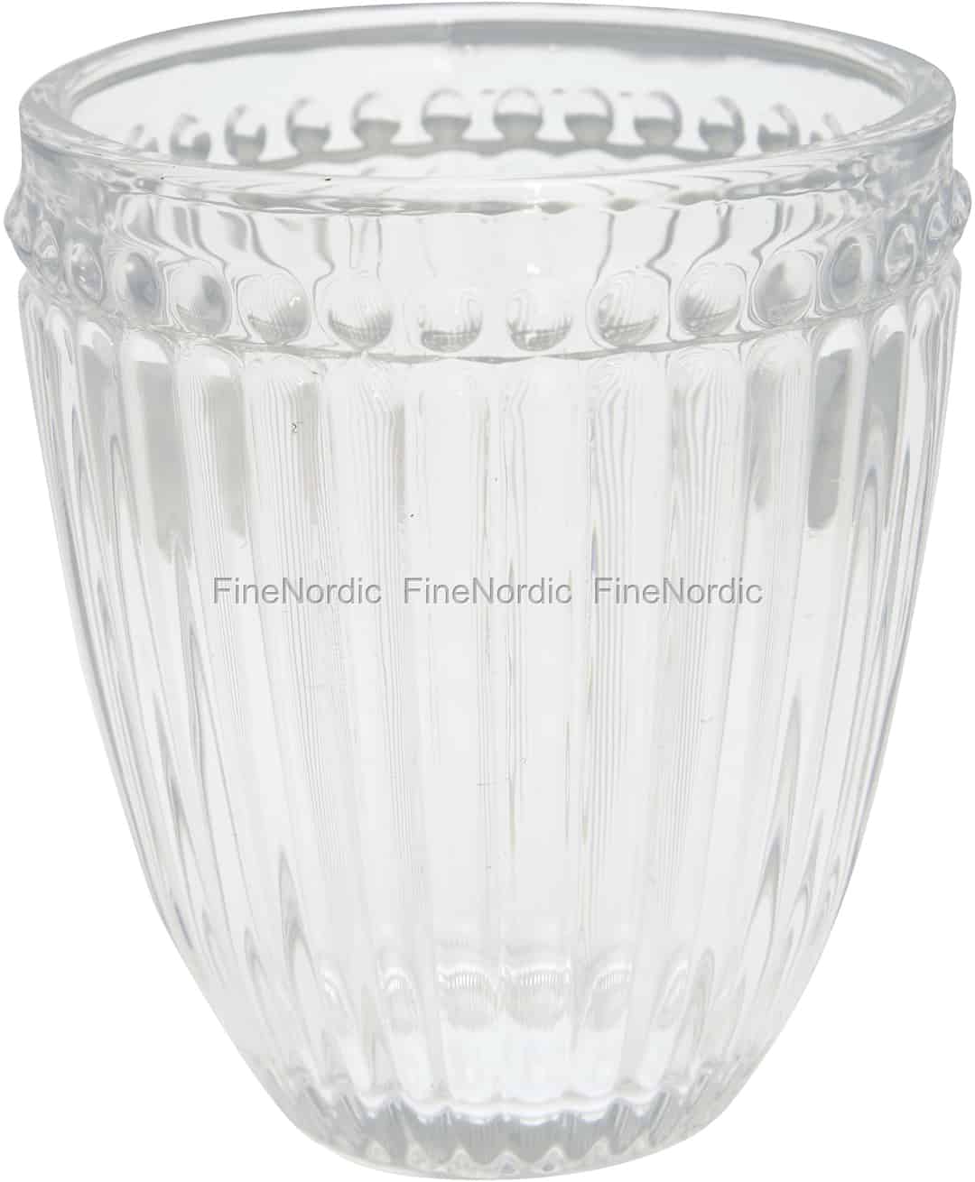 Das durchsichtige Wasserglas Alice Clear von GreenGate sieht schlicht jedoch sehr elegant aus mit seinem hübschen Glasrelief. Das Trinkglas hat eine Kapazität von 300 ml und es kann nicht nur für Wasser, sondern auch für Saft und Milch und andere Getränke genutzt werden. Sie können den Glasbecher mit der Stoneware aus vielen GreenGate Serien mischen, denn der gedeckte Tisch sieht noch einladender und interessanter aus, wenn Geschirrteile aus verschiedenen Materialien kombiniert werden.