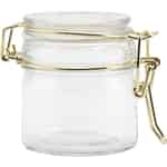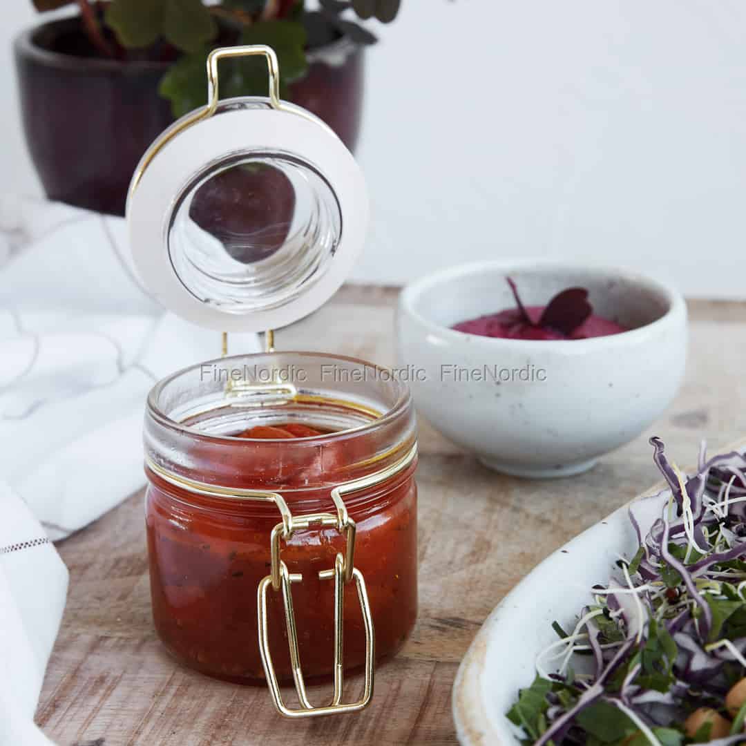 Die Aufbewahrungsgläser Vario von House Doctor sind in den Größen Mini, Klein und Groß erhältlich und bewahren Ihre Vorräte sicher auf. Dieses Mini Vorratsglas hat die perfekte Größe für selbstgemachte Marmelade oder zum Aufbewahren von gesunden Sonnenblumenkernen oder Kürbiskernen zum Beispiel. Das transparente Glas wird mit einem Verschluss aus Silikon und Messing geliefert, der es zu einem dicht verschlossenen Vorratsbehälter macht. Verwenden Sie es in Ihrer Speisekammer für Ihre Vorräte oder bewahren Sie andere kleine Gegenstände darin auf, z. B. kleine Büromaterialien im Home-Office oder Perlen im Kinderzimmer. Die Vario Aufbewahrungsgläser von House Doctor sind nicht nur praktisch und nützlich, die Kombination aus klarem Glas und gold-farbenem Deckelverschluss sieht auch gleich so gut aus, dass Sie sie einfach auf Ihrer Küchentheke stehen lassen können oder auch direkt auf den Esstisch stellen können. Wenn Ihnen das Mini Aufbewahrungsglas genauso gut gefällt wie uns, dann sollten Sie sich vielleicht auch das kleine und das große ansehen, welche Ihnen weitere Aufbewahrungsmöglichkeiten bieten.