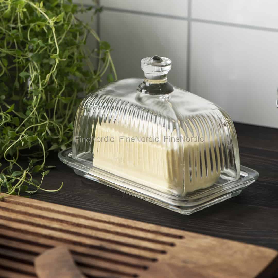 Die Butterbox von Ib Laursen ist nicht nur eine praktische Aufbewahrungsbox für Ihre Butter, sie sieht mit ihrem gerillten Design auch sehr attraktiv aus. Dank des transparenten Glases können Sie sofort sehen, wie viel Butter Sie noch übrig haben. Dafür brauchen Sie noch nicht mal den Deckel anzuheben. Der Glasdeckel lässt sich leicht an seinem schönen runden Griff anheben und der Deckel bedeckt und schützt die Butter, wenn Sie sie im Kühlschrank aufbewahren. Dank des zeitlosen, klaren Aussehens dieser Butterdose können Sie sie mit allen Arten von Gerichten kombinieren und es wird nie aus der Mode kommen.
