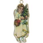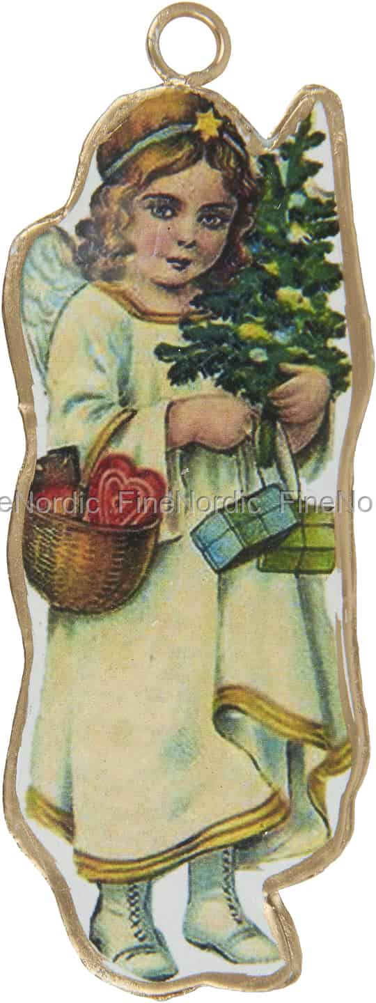 Der Ib Laursen Engel zum Aufhängen mit Geschenken in der Hand ist ein hübscher Weihnachtsschmuck für den Weihnachtsbaum. Auf dem Metallanhänger ist ein Engel im hellen Gewand zu sehen, der um seinen Kopf ein Haarband mit Stern trägt. In der einen Hand hält er einen mit Leckereien gefüllten Korb und in der anderen einen kleinen Tannenbaum und Geschenke. Hinter dem Rücken des Engelchens schaut ein Flügel hervor. Der Weihnachtsanhänger aus Metall hat einen goldfarbenen Rand an dem oben ein runder Ring angebracht ist, womit man ihn leicht an einem Tannenzweig oder einem Weihnachtskranz anhängen kann.