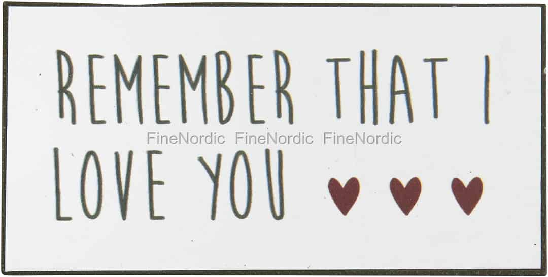 Mögen Sie Magnete mit einem klugen Spruch oder einer kleinen Liebesbotschaft? Das kleine Magnetschild von Ib Laursen „Remember that I love you“ ist eine schöne Erinnerung für jemanden, wie sehr Sie ihn lieb haben. Neben den in Schwarz geschriebenen Worten Remember that I love you sind auch drei rote Herzen auf dem Schildchen abgebildet und diese kommen auf dem hellen Hintergrund besonders gut zur Geltung. Befestigen Sie das Magnetschildchen von Ib Laursen an einem Kühlschrank oder an einer Metalltafel, genau dort wo ihr Lieblingsmensch es gut und oft sehen kann, oder nutzen Sie es als kleine Überraschung für einen geliebten Menschen.