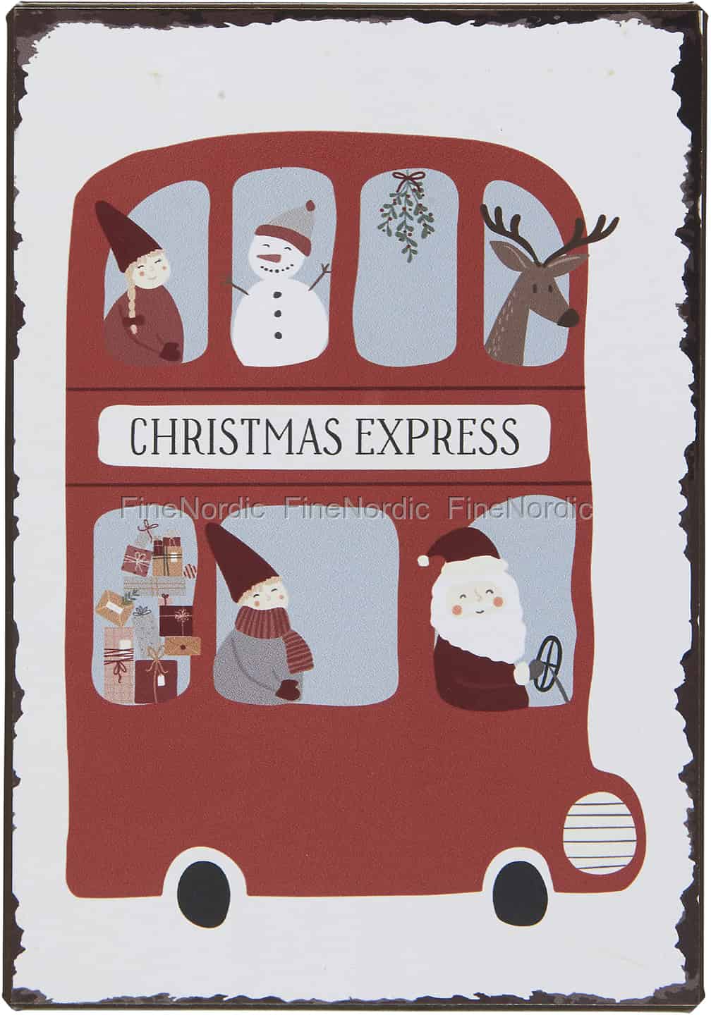 Das Christmas Express Metallschild von Ib Laursen zeigt einen roten Doppeldecker Bus der vom Weihnachtsmann gefahren wird. Mit an Board sind ein Junge und ein Mädchen dick eingepackt in Winterkleidung, ein Schneemann, ein Rentier, ein Mistelzweig und viele aufeinander gestapelte Pakete. In der Mitte des Doppeldecker Busses sind die Worte Christmas Express zu lesen. Die unbemalt aussehenden Stellen entlang der Kanten sind gewollt und tragen zum nostalgischen Charmes des Metallschilds bei. Das Schild kann angehängt werden oder auf ein Regal gestellt werden. Das Ib Laursen Christmas Express Metallschild kann gut in bereits vorhandenen Weihnachtsschmuck integriert werden.