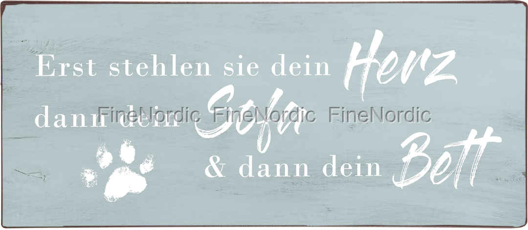 Egal welcher von unseren vierbeinigen Freunden hier gemeint ist, ob Katze oder Hund, das Schild passt auf beide perfekt. Denn genau so passiert es: Erst das Herz, dann das Sofa, dann das Bett und schon ist klar, wer der Chef in Haus ist. Und wenn Sie nicht selbst Katzen- oder Hundefan sind, dann ist das Shabby-Chic Schild in dezenten Farben eine tolle Geschenkidee für den Tierliebhaber in Freundeskreis. Wenn Sie Metallschilder mit witzigen Sprüchen mögen, dann schauen Sie sich bitte auch die vielen anderen Schilder in unserem Warensortiment an.