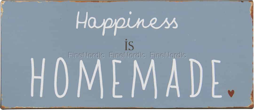 Das Ib Laursen Metallschild Happiness is Homemade ist ein hübsches und aussagefreudiges Wohnaccessoire. Auf dem hellblauen, rechteckigen Schild stehen mit schönen Lettern geschrieben die Worte: Happiness is Homemade und ein kleines rotes Herzchen unterstreicht die Botschaft. Das längliche Schild lässt sich wunderbar in allen Wohnräumen integrieren und man kann es leicht an seinen beiden Aufhängern, die auf der Rückseite des Schildes angebracht sind, aufhängen. Die unbemalt aussehenden Stellen entlang der Kanten sind gewollt und tragen zum nostalgischen Charmes des Metallschilds von Ib Laursen bei.