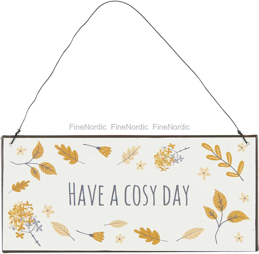 Das Have a Cosy Day Metallschild von Ib Laursen ist mit Herbstlaub und Blümchen geschmückt und in der Mitte stehen die Worte: Have a cosy day. An dem kleinen Schild ist ein Draht zum Aufhängen befestigt, womit Sie es an einen Nagel, Haken oder Griff anhängen können. Das rechteckige Metallschild zum Aufhängen ist ein hübsches Wohnaccessoire für den Flur und auch für die Wohnräume. Wir haben eine schöne Auswahl an Ib Laursen Metallschildern in unserem Webshop anzubieten. Hier finden Sie Schilder mit Sprüchen, die Sie zum Lächeln und auch zum Nachdenken bringen werden. Sie sind in verschiedenen Größen, Designs und in Dänisch, Englisch und Deutsch erhältlich.