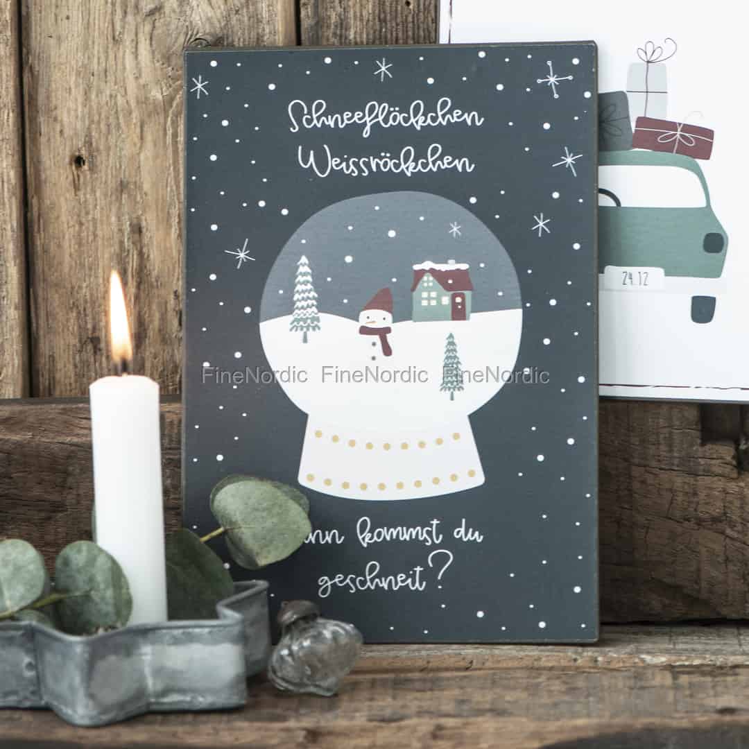 Auf dem Ib Laursen Metallschild Schneeflöckchen, Weissröckchen ist eine Schneekugel mit Schneemann, ein Haus, Tannen und viel Schnee zu sehen. Die hübsche Schneekugel kommt auf dem dunklen Hintergrund des Metallschilds besonders gut zur Geltung. Über der Schneekugel stehen die Worte „Schneeflöckchen, Weissröckchen“ und unten drunter „Wann kommst Du geschneit“ in weißen Buchstaben. Um die Schneekugel herum sind Sterne und fallender Schnee zu sehen. Das gut aussehende Weihnachtsschild kann gut mit anderer Weihnachtsdeko integriert werden. Sie können es auf ein Regal stellen oder an der Wand anhängen, je nachdem was Sie bevorzugen. Wir haben eine gute Auswahl an Ib Laursen Metallschilder in unserem Webshop anzubieten.