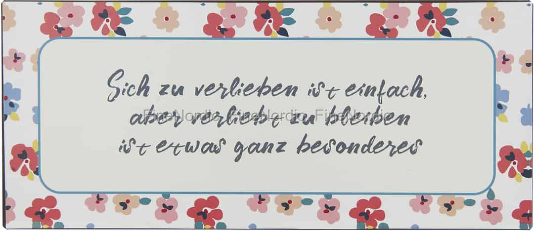 Das Metallschild von Ib Laursen: „Sich zu verlieben ist einfach, aber verliebt zu bleiben ist was ganz besonderes“ gefällt uns nicht nur wegen des guten Aussehens, sondern auch wegen des schönen Spruchs. Die kleine Liebesbotschaft dieses rechteckigen Metallschilds ist in Schreibschrift geschrieben und wird von einem hübschen Blumenmuster eingerahmt. Hängen Sie es im Schlafzimmer auf und es wird eine schöne tägliche Erinnerung an Ihre eigene glückliche Liebesgeschichte sein. Es ist auch ein schönes Valentinstag- oder Jubiläumsgeschenk für Ihren Partner und ein charmanter Glückswunsch für ein frisch verheiratetes Paar. Wenn Sie Metallschilder mögen, dann schauen Sie sich doch gerne mal die vielen verschiedenen Schilder an, die wir von Ib Laursen anzubieten haben. Sie sind in verschiedenen Größen und mit allerlei Zitaten erhältlich, die Sie sowohl zum Lächeln als auch zum Nachdenken bringen werden.