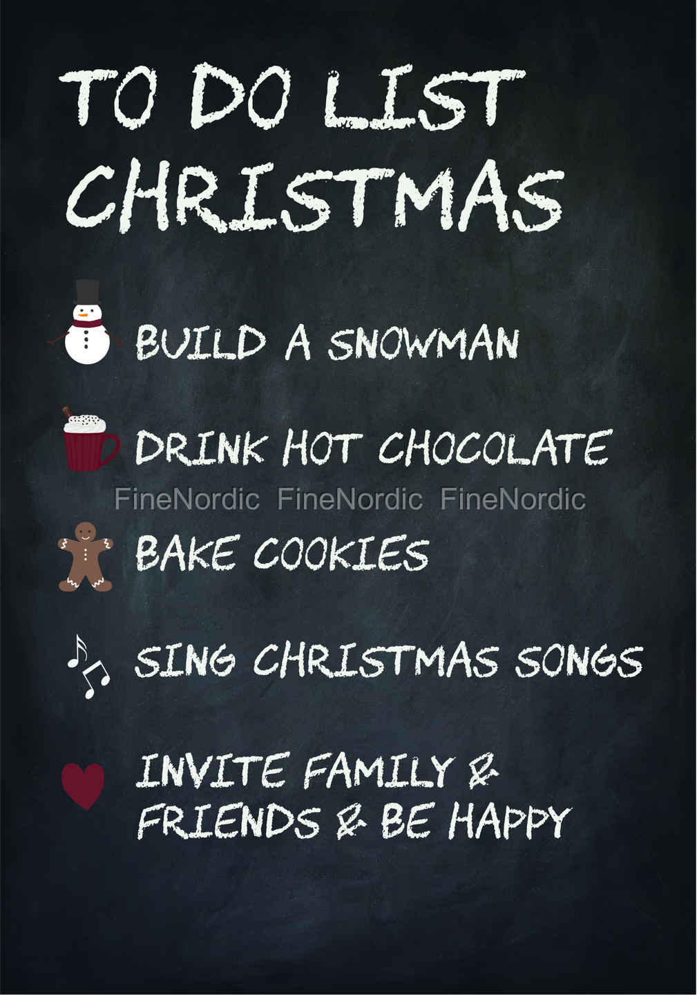 Das Schild: „To Do List Christmas“ von Ib Laursen ist eine liebgemeinte Mahnung, die weihnachtlichen Feiertage so richtig zu genießen. Machen Sie Sachen die Ihnen Freude bereiten, wie einen Schneemann bauen, heiße Schokolade trinken, Kekse backen und Weihnachtslieder singen. Laden Sie Ihre Familie und Freunde ein und feiern Sie zusammen ein glückliches Weihnachtsfest. Auf dem schwarzen Schild steht all das in weißer Schrift geschrieben. Sie können auch einen Schneemann, eine Tasse mit heißer Schokolade, einen Lebkuchenmann, ein paar Noten und ein Herz darauf abgebildet sehen. Hängen Sie dieses charmante Schild in Ihrem eigenen Zuhause auf oder schenken Sie es jemandem als gedankenvolles Weihnachtsgeschenk. Dieses Schild ist auch in deutscher Sprache in unserem Webshop erhältlich.