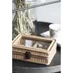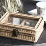 Bewahren Sie Ihre Ringe, Broschen und Edelsteine sicher in dieser schönen Schmuckschatulle von Ib Laursen auf. Das Schmuckkästchen hat schöne Rattan Akzente und einen in Holz eingerahmten Glasdeckel. Sie können den Deckel sicher mit dem angebrachten Metallschloss schließen. Stellen Sie diese kleine Aufbewahrungsbox auf Ihren Schminktisch, Ihren Nachttisch oder auf ein Badezimmerregal, sodass Sie sie griffbereit haben, wenn Sie Schmuck auf- oder ablegen möchten. Das Kästchen ist mit sechs Fächern ausgestattet, es hat 2 größere und 4 kleinere. Sie können den Schmuckkasten auch für einige Ihrer anderen kleinen Schätze verwenden, wie zum Beispiel hübsche Muscheln, die Sie am Strand gesammelt haben, oder andere kleine Sammlerstücke.