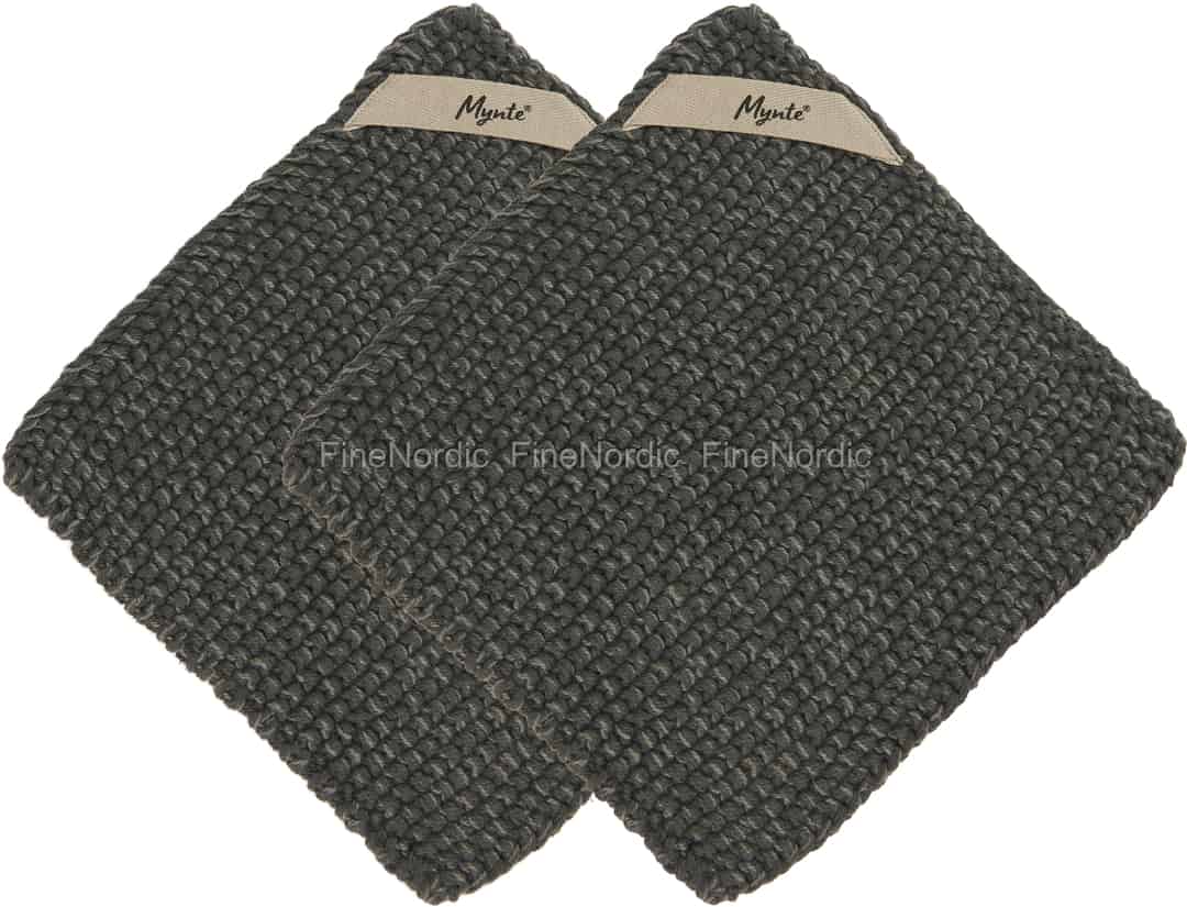 Das dunkelgraue Melange Topflappen 2er Set aus Ib Laursens beliebter Mynte Serie ist eine wahre Augenweide, dank seiner hübschen Strickoptik und des farblich gemischten Baumwollgarns. Mit den zwei OEKO-TEX Topflappen sind Ihre Hände gut geschützt, wenn Sie einen heißen Topf vom Herd nehmen wollen oder aber eine Backform aus dem Ofen. Wenn die Stricktopflappen schmutzig sind, dann können sie bei 60 C in der Waschmaschine gewaschen werden. Wenn sie nicht in Benutzung sind, dann hängen Sie sie einfach mit Ihren Mynte Stoffanhänger an einen Küchenhaken, so sind sie immer in greifbarer Reichweite, wenn sie wieder zum Einsatz kommen sollen. Die populären Mynte Topflappen von Ib Laursen sind auch in vielen, anderen Farben bei uns erhältlich, sodass bestimmt auch die farblich passenden für Ihre Küche dabei sind.