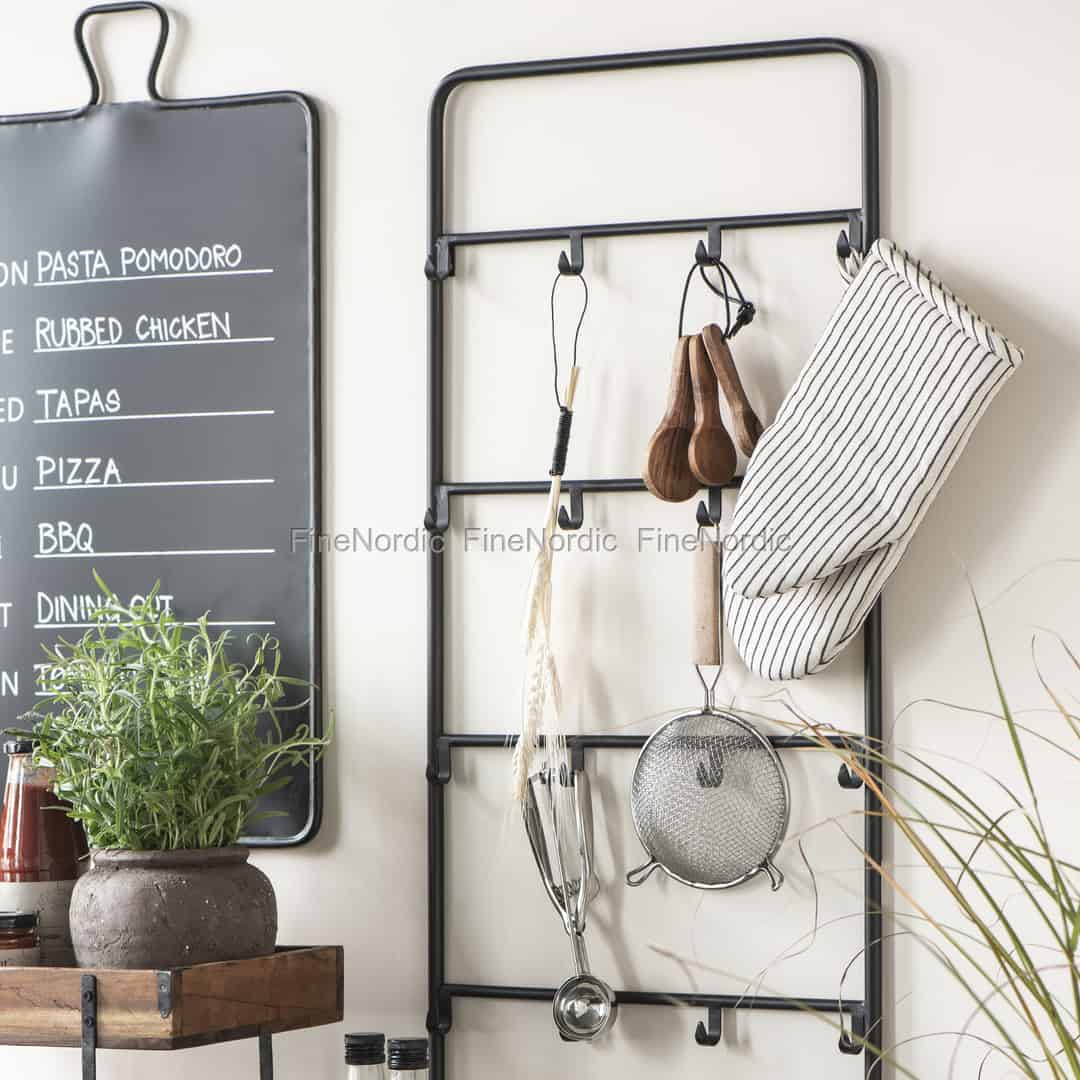 Hängen Sie die Küchenaccessoires, die sie oft oder vielleicht sogar täglich benutzen, an Ib Laursens Wanddisplay mit 16 Haken. Die schwarzen Hakenleiste hält Ihre Küchenhelfer, Backofenhandschuhe und Geschirrtücher immer für Sie in Reich- und Sichtweite. Der Metallrahmen mit seinen 16 Haken ist nicht nur sehr praktisch, sondern er ist auch sehr hübsch anzusehen. Er ist ein sehr unprätentiöser und dennoch sehr stilvoller Wandanhang, welcher der Küche eine extra Portion Lässigkeit hinzufügt. Der Metallanhang kann natürlich auch in anderen Räumen des Hauses und für andere Dinge zum Anhängen verwendet werden.