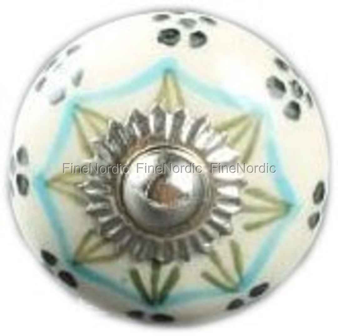 Dieser La Finesse Porzellangriff hat ein wunderschönes Muster in den Farben Schwarz und Türkis. Er hat einen Durchmesser von 3 cm und wird eine alte Kommode oder einen Schrank so richtig aufleben lassen. Der Porzellangriff lässt sich leicht an einer Tür oder einer Schublade befestigen, indem er einfach angeschraubt wird. Er verleiht einem schlichten Möbelstück einen bestimmten Charakter und sorgt bei einem einfachen schwarzen Stück Möbel für etwas mehr Aufmerksamkeit. Wenn Sie Porzellangriffe mögen, dann schauen Sie sich doch auch die anderen an, die wir in unserem Webshop anbieten. Wir haben eine große Auswahl an Porzellangriffen in verschiedenen Größen, Formen, Farben und Mustern vorrätig.