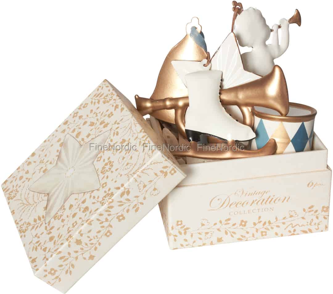 Maileg 6 Golden/Weiße Metall Ornamente in Box