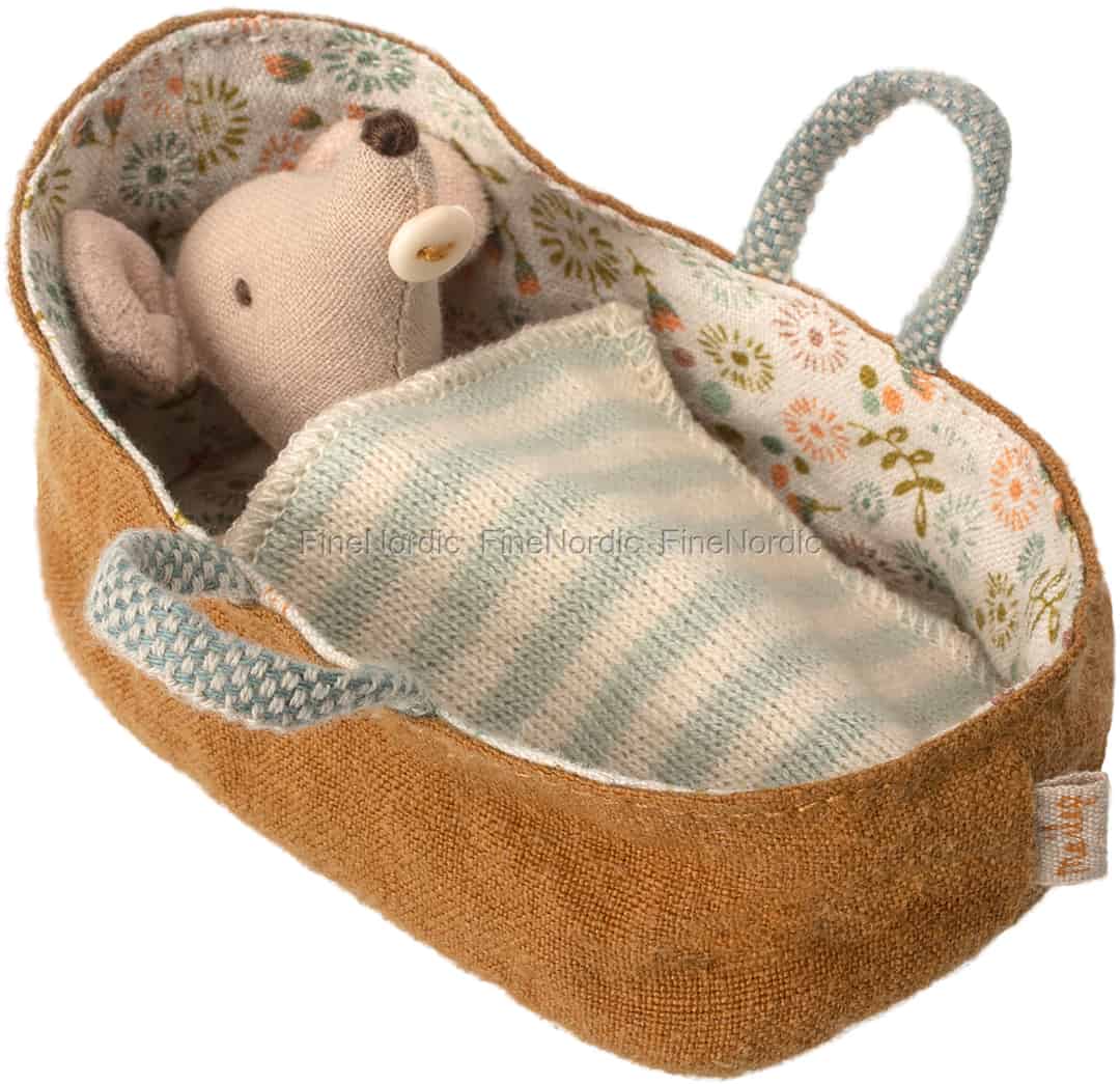 Die Baby Maus in Carrycot ist ein weiteres entzückendes Produkt von Maileg. Das Neugeborene in My Größe liegt ganz eingekuschelt in dieser Babytragetasche. Die Tragetasche kann leicht an zwei Griffen getragen werden, sodass die Baby Maus immer, zu einem Besuch bei Oma oder einem Picknick in Park, mitkommen kann. Der äußere Teil der Babytragetasche ist einfarbig, während das Innere mit einem hübschen Blumenmuster bedeckt ist. Die Maileg Baby Maus in der Tragetasche ist ein schönes Geschenk für die Geburt eines Babys und auch ein aufmerksames Präsent für einen passionierten Maileg Sammler.