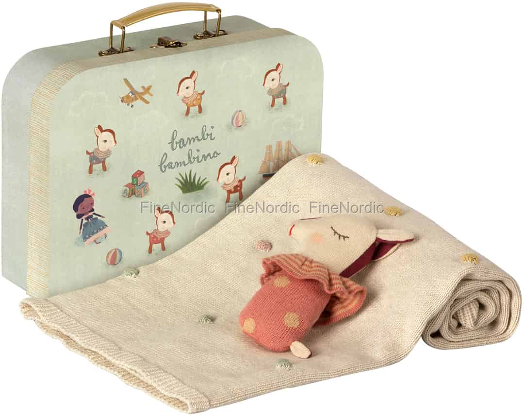 Dieses charmante Maileg Baby Geschenkset enthält eine Bambi Rassel und eine weiche Decke, beides aus OEKOTEX Baumwolle gefertigt. Sie sind in einem niedlichen handgefertigten Koffer verpackt. Der Koffer ist 26 cm breit, 19 cm hoch und 8 cm tief. Er ist mit Bambis und vielen anderen entzückenden Illustrationen geschmückt. Die gepunktete Decke misst 70 x 90 cm und kann bei 30 ° C gewaschen werden. Die Bambi Rassel ist 15 cm lang und gibt beim Schütteln ein schönes Geräusch von sich. Bambi trägt einen gestreiften Kragen und ein gepunktetes Outfit und hat ein Auge geschlossen und ein Auge offen. Dieses wundervolle Rose Geschenkset von Maileg ist eine wundervolle Geschenkidee für die Geburt oder Taufe eines Kindes.