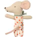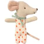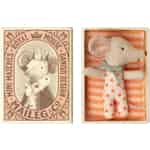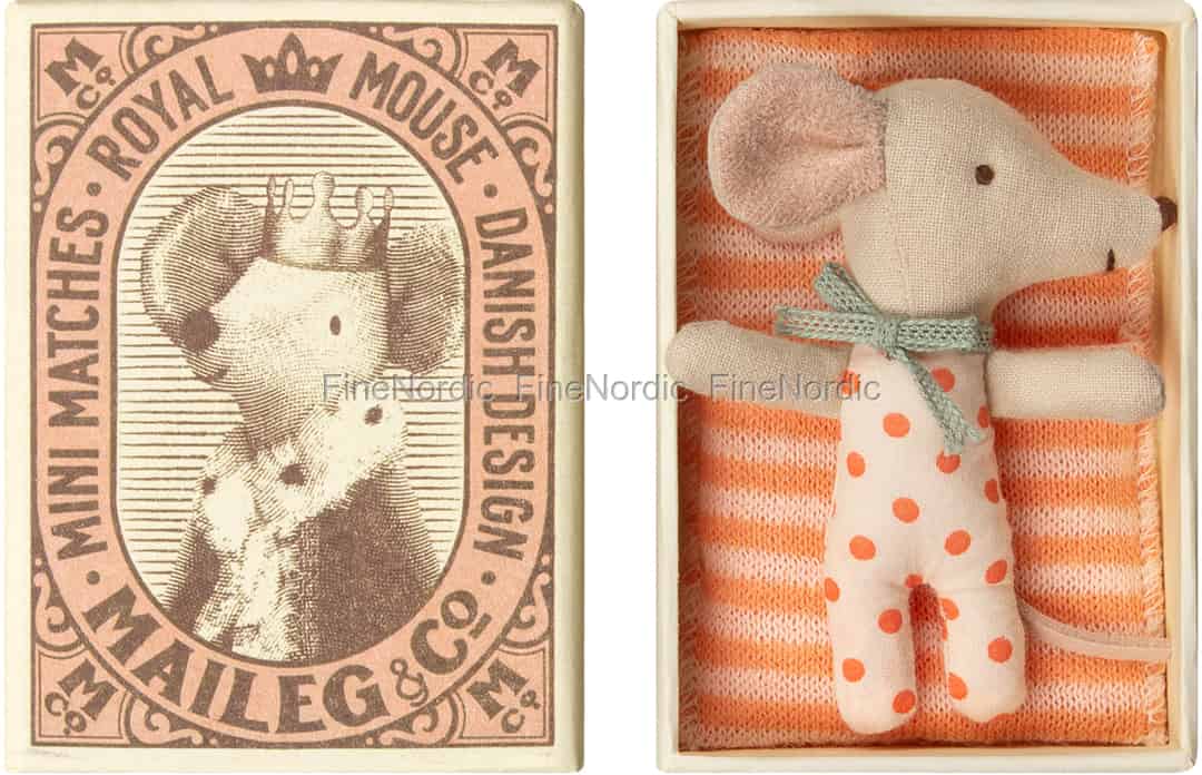 Das Maileg Babymaus Mädchen Sleepy / Wakey in einer Box 2019 hat ihren Kopf zur Seite gedreht. Auf der einen Seite schläft sie und auf der anderen Seite ist sie wach. Sie trägt ein einteiliges Outfit, das mit fröhlichen Punkten in Korallenfarbe geschmückt ist. Das kleine Mäuschen schläft in einem gestreiften Schlafsack, schön eingekuschelt in einer hübsch dekorierten, handgefertigten Streichholzschachtel. Diese Sleepy/Wakey Babymaus ist ein absolutes Must-Have für alle Maileg Mäuse Fans.