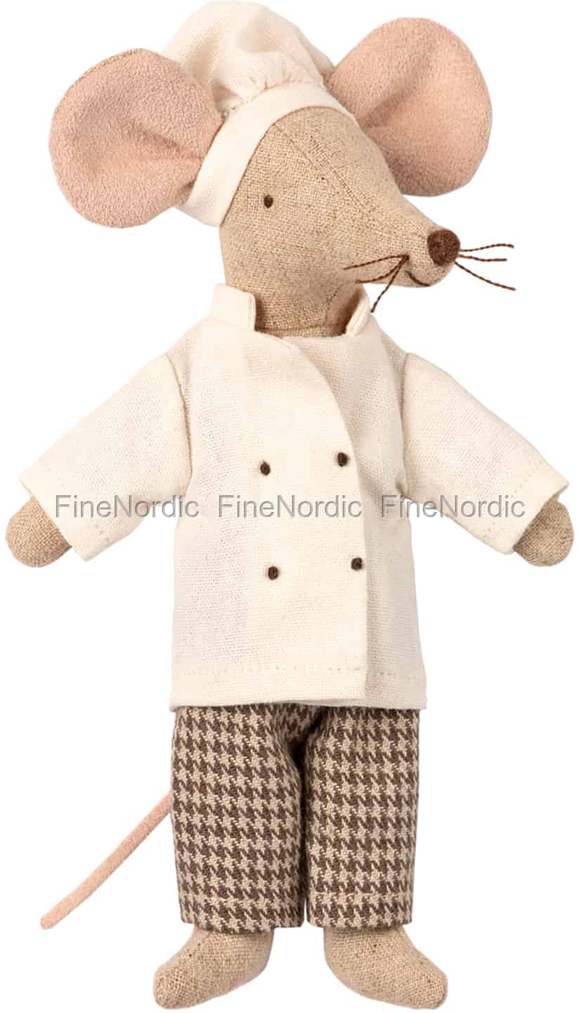 Oh, là là, wen haben wir hier? Es ist Monsieur Michelin Maus, der mit seiner Kochmütze, Jacke und gemusterter Hose einfach super schick aussieht. Er kann sofort loslegen und ein extravagantes Festmahl auf den Tisch zaubern. Sollte es eine Käsetorte sein, oder vielleicht eine Suppe au Fromage à la Chef? Er kocht Ihnen, was auch immer Sie möchten. Er ist wegen seiner wunderbaren Kochkünste sehr beliebt in der Maileg Mäusewelt, besonders bei den Mäuse Damen. Er ist außerdem eine wunderbare Ergänzung für jede Maileg Sammlung.