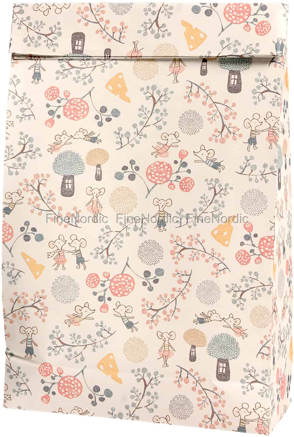 Machen Sie sich keine großen Gedanken wegen des Einpacken des Geschenkes, sondern verschenken Sie sie es einfach in einer Geschenktüte! Geschenktüten sind besonders nützlich, wenn man es eilig hat. Legen Sie einfach das Geschenk in die Tüte, falten Sie die Tüte oben einmal um und schon kann die Tüte mit Geschenk den Besitzer tauschen. Sie können der Tüte eine kleine Karte, ein Band oder eine Schleife hinzufügen oder sie so verschenken, wie sie ist. Die Maileg Geschenktüte mit Mäuseparty ist mit einem bezaubernden Mäuse Print versehen. Auf diesem hübsch farblich abgestimmten Design finden Sie Partymäuse, Käseecken, Pilzhäuser, Blumen und blättrige Stiele. Die Tüte hat eine Höhe von 28,5 cm und kann an Geburtstagen als Geschenktüte oder als mit einer Überraschung gefüllten Tüte für die Gastgeberin verwendet werden. Sie können sie auch mit leckeren Süßigkeiten oder anderen Leckereien füllen und sie als kleines Dankeschön für einen hilfreichen Kollegen oder Nachbarn nutzen. Eine Tasche, so viele Möglichkeiten!