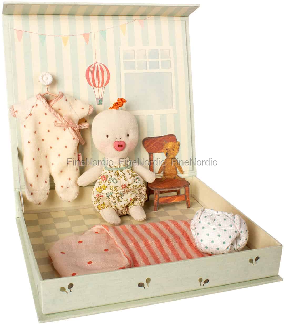 Schauen Sie doch mal, was der Storch bei FineNordic abgeliefert hat! Nämlich dieses kleine Freudenbündel namens Ginger Baby. Es wird in einer Baby Ginger Room Box geliefert. Öffnen Sie einfach die Schachtel und schon sehen Sie ein Kinderzimmer mit einem Klappstuhl, einem Kleiderbügel, einer Pucksack und einer Windel. Das Maileg Baby Ginger Set ist eine schöne Ergänzung Ihrer Maileg Ginger Sammlung.