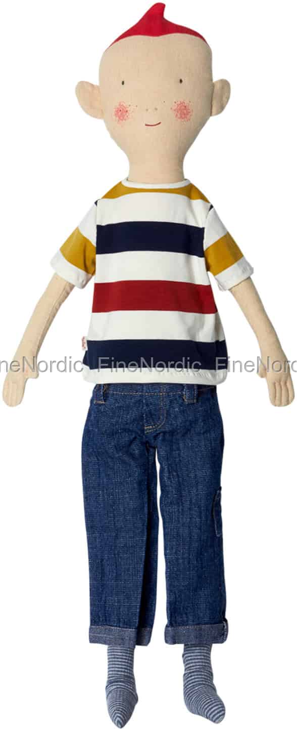 Der Ginger Bruder ist einfach ein gutaussehendes Kerlchen, von seiner coolen Ginger Frisur bis runter zu seinen gestreiften Socken. Der Maileg Ginger Junge trägt eine Jeans und ein gestreiftes, kurzärmeliges Hemd. Er liebt es, Ginger Familie viel Spaß zu haben und hat immer ein Lächeln im Gesicht. Im Moment sind seine Wangen jedoch ein wenig gerötet. Vielleicht weil er aufgeregt ist, seinen neuen Freund zu treffen? Bist du vielleicht der neue Freund?