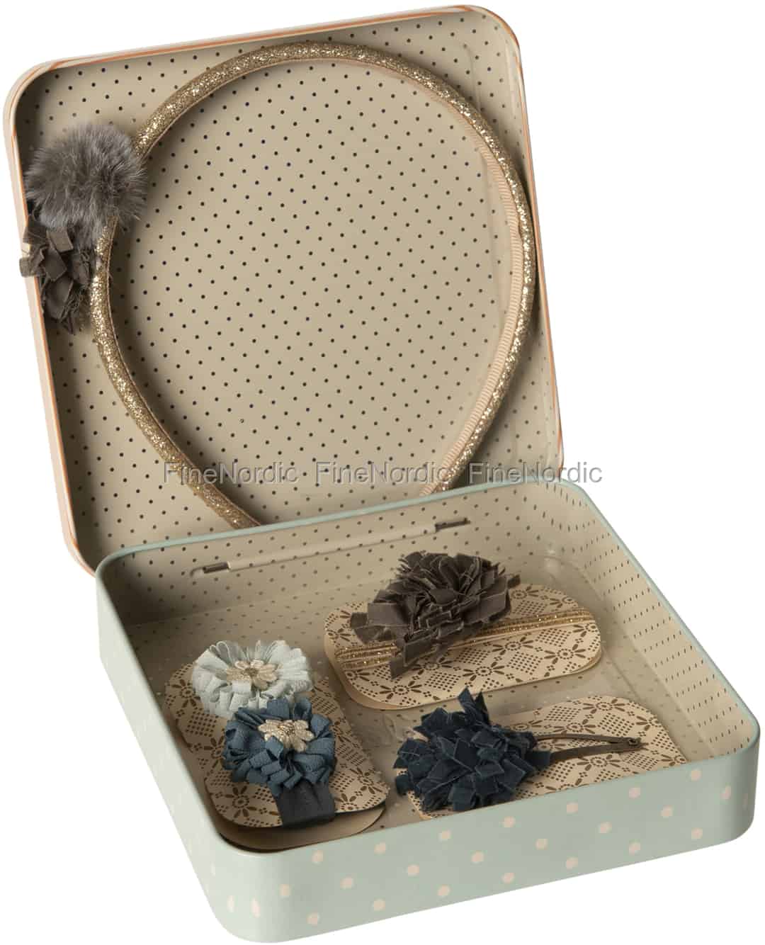 Schmücke Deine Haare mit dem Maileg Haarschmuck Geschenkset Blau für Kinder. Du kannst jeden Tag ein anderes, oder dass zu Deinem jeweiligen Outfit passende, tragen. Der Haarschmuck wird in einer gut aussehenden, gepunkteten Metallbox geliefert, sodass Du sie immer alle an einem Ort aufbewahren kannst. Du kannst sie auch benutzen, wenn du mit deiner Freundin Verkleiden spielst, oder aber auch, wenn Du zu einer Geburtstagsfeier oder einem anderen festlichen Anlass eingeladen wirst.
